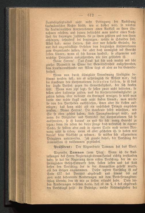 Handelsgesetzbuches nicht mehr Bedingung der Ausübungkaufmännischer Rechte bleibt, wie er bisher war, so würdendie kaufmännischen Korporationen einen Ausfall an ihren Ein-nahmen erleiden, und davon befürchtet man wieder einen Nach-theil für diejenigen Institute, die zu ihnen gehören und von ihnenabhängen, besonders bei denjenigen, welche in Schulden sind.Alles das, meine Herren, sind aber nur kasuellc Gründe, dienur das augenblickliche Bestehen von dergleichen Korporationenzum Gegenstande haben, die aber doch unmöglich ins Gewichtfallen können, wenn es sich darum handelt, so allgemeine undwichtige Prinzipien auszusprcchen, wie hier geschehen ist.