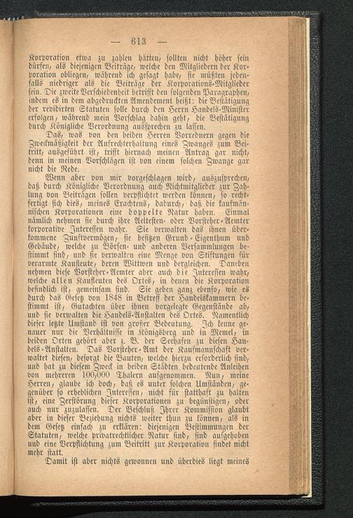 Wenn aber von mir vorgeschlagen wird, auszusprechen,daß durch Königliche Verordnung auch Nichtmitgliedcr zur Zah-lung von Beiträgen sollen verpflichtet werden können, so recht-fertigt sich dies, meines Erachtcns, dadurch, daß die kaufmän-nischen Korporationen eine doppelte Natur haben. Einmalnämlich nehmen sie durch ihre Acltcsten- oder Vorsteher-Aemterkorporative Interessen wahr. Sie verwalten das ihnen über-kommene Zunftvermögen, sie besitzen Grund-Eigenthum undGebäude, welche zu Börsen- und anderen Versammlungen be-stimmt sind, und sie verwalten eine Menge von Stiftungen fürverarmte Kaufleute, deren Wittwen und dergleichen. Danebennehmen diese Vorsteher-Aemter aber auch die Interessen wahr,welche allen Kaufleuten des Ortes, in denen die Korporationbefindlich ist, gemeinsam sind. Sie geben ganz ebenso, wie esdurch das Gesetz von 1848 in Betreff der Handelskammern be-stimmt ist, Gutachten über ihnen vorgelegte Gegenstände ab,und sie verwalten die Handels-Anftalten des Ortes. Namentlichdieser letzte Umstand ist von großer Bedeutung. Ich kenne ge-nauer nur die Verhältniße in Königsberg und in Memel , inbeiden Orten gehört aber z. B. der Seehafen zu diesen Han-dels-Anstalten. Das Vorsteher-Amt der Kaufmannschaft ver-waltet diesen, besorgt die Bauten, welche hierzu erforderlich sind,und hat zu diesem Zweck in beiden Städten bedeutende Anleihenvon mehreren 100,000 Thalern ausgenommen. Nun, meineHerren, glaube ich doch, daß es unter solchen Umständen, ge-genüber so erheblichen Interessen, nicht für statthaft zu haltenist, eine Zerstörung dieser Korporationen zu begünstigen, oderauch nur zuzulassen. Der Beschluß Ihrer Kommission glaubtaber in dieser Beziehung nichts weiter thun zu können, als indem Gesetz einfach zu erklären: diejenigen Bestimmungen derStatuten, welche privatrechtlichcr Natur sind, sind aufgehobenund eine Verpflichtung zum Beitritt zur Korporation findet nichtmehr statt.