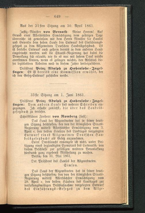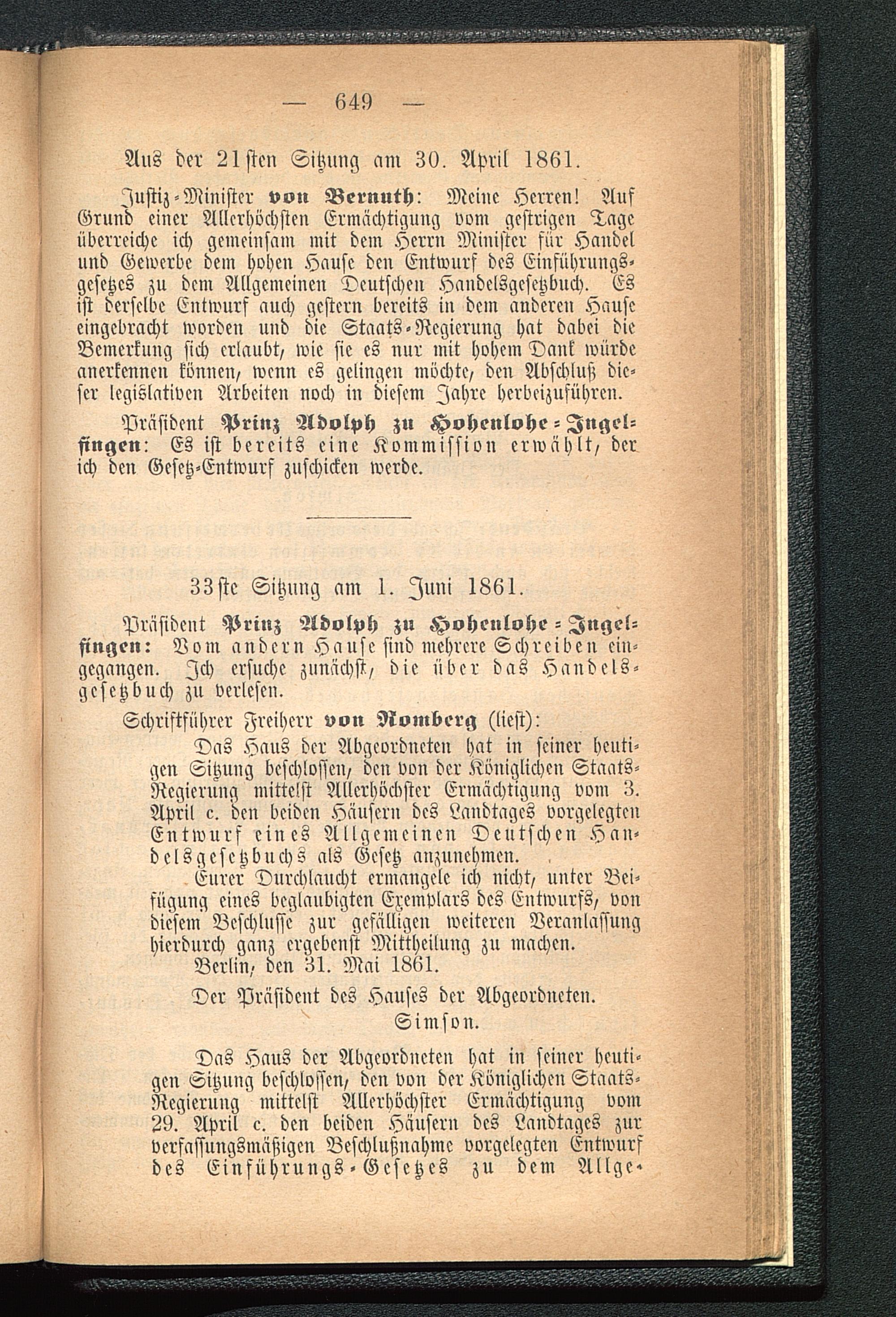 Präsident Prinz Adolph zu Hohcnlohe - Jngcl-fingc n : Voin andc r n Hause sind mehrere Schreiben ein-gegangen. Ich ersuche zunächst, die über das Handels-gesetzbuch zu verlesen.