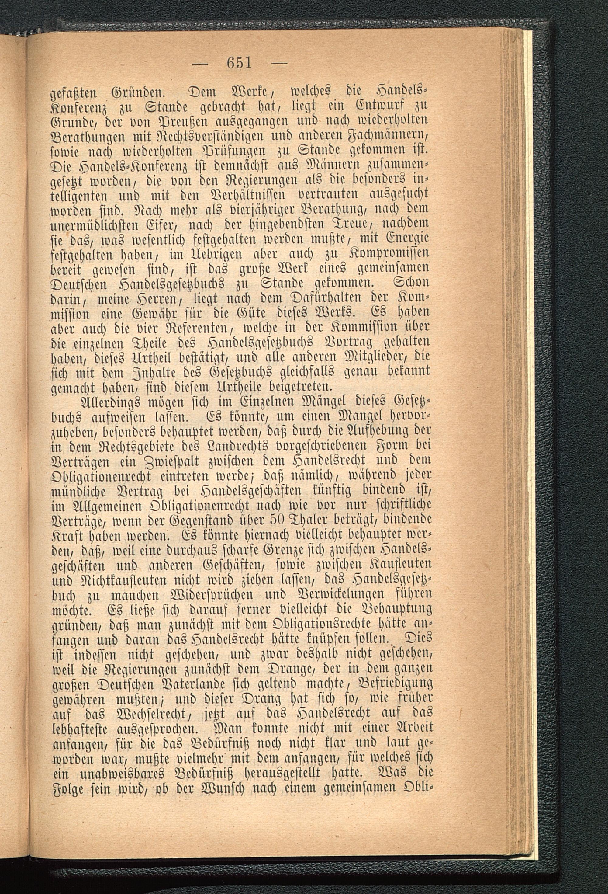 Allerdings mögen sich im Einzelnen Mängel dieses Gesetz-buchs ausweisen laßen. Es könnte, um einen Mangel hervor-zuheben, besonders behauptet werden, daß durch die Aufhebung derin dem Rechtsgebietc des Landrechts vorgeschriebenen Form beiVerträgen ei» Zwiespalt zwischen dem Handelsrecht und demObligatiouenrecht eintreten werde/ daß nämlich, während jedermündliche Vertrag bei Handelsgeschäften künftig bindend ist,im Allgemeinen Obligatiouenrecht nach wie vor nur schriftlicheVerträge, wenn der Gegenstand über 50 Thaler beträgt, bindendeKraft habe» werden. Es könnte hiernach vielleicht behauptet wer-den, daß, weil eine durchaus scharfe Grenze sich zwischen Handels-geschäften und anderen Geschäften, sowie zwischen Kaufleutenund Nichtkaufleuten nicht wird ziehen lassen, das Handelsgesetz-buch zu manchen Widersprüchen und Verwickelungen führenmöchte. Es ließe sich darauf ferner vielleicht die Behauptunggründen, daß man zunächst mit dem Obligatiousrechte hätte an-fangen und daran das Handelsrecht hätte knüpfen sollen.. Diesist indessen nicht geschehen, und zwar deshalb nicht geschehen,weil die Regierungen zunächst dem Dränge, der in dem ganzengroßen Deutschen Vatcrlande sich geltend machte, Befriedigunggewähren mußten/ und dieser Drang hat sich so, wie früherauf das Wechselrecht, jetzt auf das Handelsrecht auf daslebhafteste ausgesprochen. Man konnte nicht mit einer Arbeitanfangen, für die das Bedürfniß noch nicht klar und laut ge-wordcu war, mußte vielmehr mit dem anfangen, für welches sichein unabweisbares Bedürfniß herausgestellt hatte. Was dieFolge sein wird, ob der Wunsch nach einem gemeinsamen Obli-