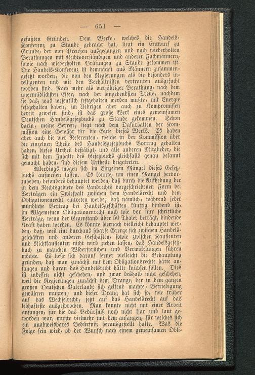 gefaßten Gründen. Dem Werke / welches die Handels-Konfcrcuz zu Stande gebracht hat/ liegt ein Entwurf zuGrunde/ der von Preußen ausgegangen und nach wiederholtenBerathungen mit Ncchtsvcrständigcn "und anderen Fachmännern,sowie nach wiederholten Prüflingen zu Stande gekommen ist.Die Haudels-Konfcrenz ist demnächst aus Männern zusammen-gesetzt worden, die von den Regierungen als die besonders in-telligenten und mit den Verhältnißen vertrauten ausgesuchtworden sind. Nach mehr als vierjähriger Berathung, nach demunermüdlichsten Eifer, nach der hingebendstcn Treue, nachdemsie das, was wesentlich festgehalten werden mußte, mit Energiefestgehalten haben, im Uebrigcn aber auch zu Kompromißenbereit gewesen sind, ist das große Werk eines gemeinsamenDeutschen Handelsgesetzbuchs zu Stande gekommen. Schondarin, meine Herren, "liegt nach dem Dafürhalten der Kom-mission eine Gewähr für die Güte dieses Werks. Es habenaber auch die vier Referenten, welche in der Kommission überdie einzelnen Theile des Handelsgesetzbuchs Vortrag gehaltenhaben, dieses Urtheil bestätigt, und alle anderen Mitglieder, diesich mit dem Inhalte des Gesetzbuchs gleichfalls genau bekanntgemacht haben, sind diesem Urtheile beigetrctcn.