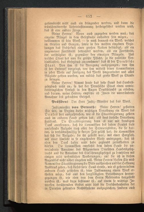 Iustizministcr von Bernuth: Meine Herren! gestattenSie mir, im Beginn dieser wichtigen Berathung ein Wort desDankes hier auszusprechcn, wie es die Staatsregicrung gesternauch im anderen Hause gethan hat, als dort dieselbe Berathungstattfand. Die Staatsregicrung kann es nur mit freudigemDank anerkennen, daß die Kommission des hohen Hauses dieseumfassende Aufgabe trotz aller der Schwierigkeiten, die sie dar-bot, in vcrhältnißmäßig so kurzer Zeit gelöst hat/ die Kommissionhat sich der Aufgabe, die ihr gestellt war, mit einer Sorgfalt,mit einer Umsicht in so eingehender Weise unterzogen, daß icheben den Dank dafür nicht habe geglaubt zurückhalten zudürfen. Die Kommission empfiehlt dem hohen Hause die un-veränderte Annahme des Allgemeinen Deutschen Handelsgesetz-buchs und die Annahme des Einführungsgcsctzcs zu demselben miteinigen nicht wesentlichen Aenderungen, aus die ich in diesemAugenblick nicht näher eingehen will. Meine Herren! Lassen Sie michNamens der Staatsregicrung die Bitte aussprcchcn und der HoffnungAusdruck geben, daß dieses höbe Haus ebenso, wie es gestern in demanderen Hause geschehen ist, seine Zustimmung einem Werk er-theilen möge, das aus den sorgfältigsten Berathungen hervor-gegangen ist, wie eben von dem Herrn Referenten dargestelltworden ist, was dazu bestimmt ist, auf einem so wichtige In-teressen berührenden Gebiet nicht blos die Verschiedenheiten derin Preußen geltenden Nechtsshstcme auszugleichen, sondern auch