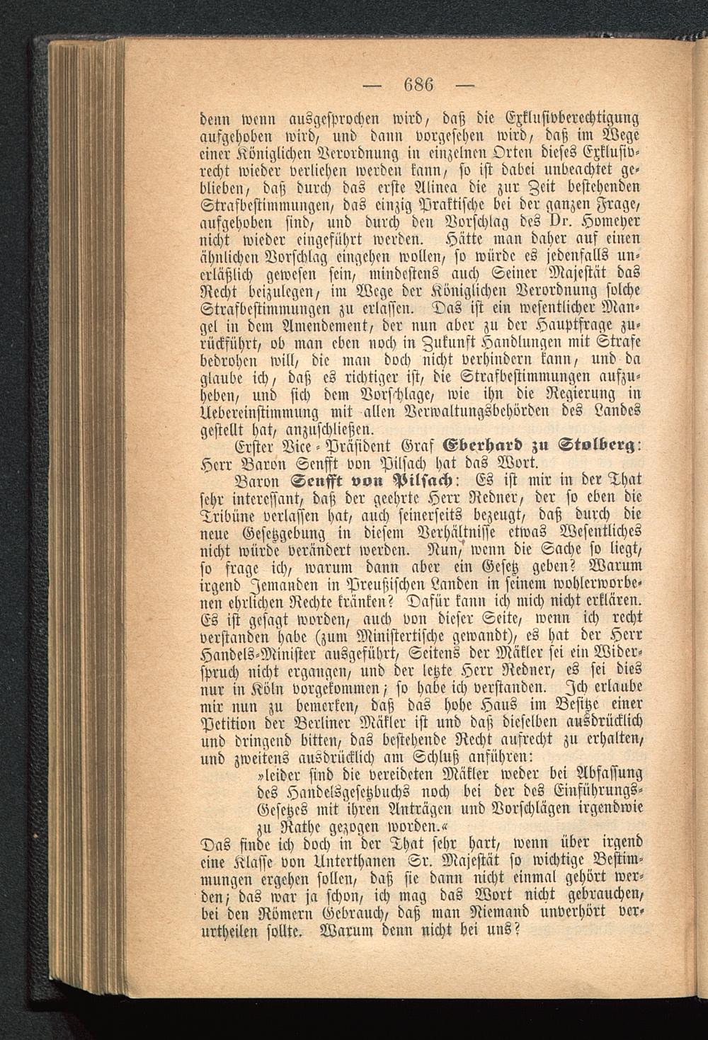 Baron Senfft von Pilsach: Es ist mir in der Thatsehr interessant, daß der geehrte Herr Redner, der so eben dieTribüne verlassen hat, auch seinerseits bezeugt, daß durch dieneue Gesetzgebung in diesem Verhältniße etwas Wesentlichesnicht würde verändert werden. Nun, wenn die Sache so liegt,so frage ich, warum dann aber ein Gesetz geben? Warumirgend jemanden in Preußischen Landen in seinem wohlerworbe-nen ehrlichen Rechte kränken? Dafür kann ich mich nicht erklären.Es ist gesagt worden, auch von dieser Seite, wenn ich rechtverstanden habe (zum Ministertische gewandt), es hat der HerrHandels-Minister ausgeführt, Seitens der Mäkler sei ein Wider-spruch nicht ergangen, und der letzte Herr Redner, es sei diesnur in Köln vorgekommen / so habe ich verstanden. Ich erlaubemir nun zu bemerken, daß das hohe Haus im Besitze einerPetition der Berliner Mäkler ist und daß dieselben ausdrücklichund dringend bitten, das bestehende Recht aufrecht zu erhalten,und zweitens ausdrücklich am Schluß anführen: