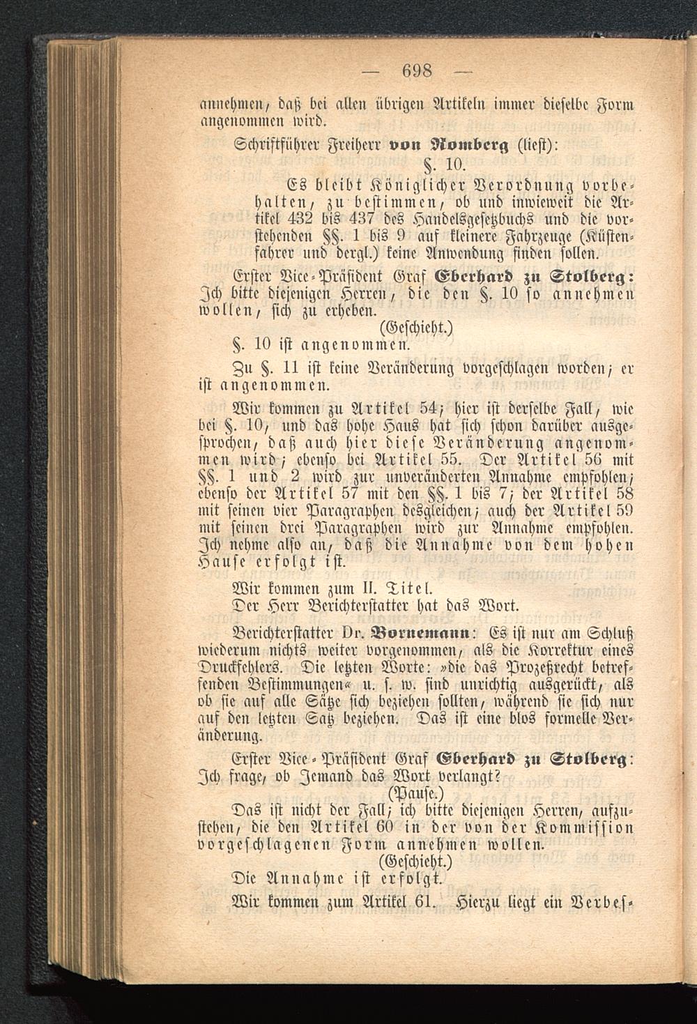 Berichterstatter Dr. Voruemann: Es ist nur am Schlußwiederum nichts weiter vorgenommen/ als die Korrektur einesDruckfehlers. Die letzten Worte: »die das Prozeßrecht betref-fenden Bestimmungen« u. s. w. sind unrichtig ausgerückt/ alsob sie auf alle Sätze sich beziehen sollten/ während sie sich nurauf den letzten Satz beziehen. Das ist eine blos formelle Ver-änderung.