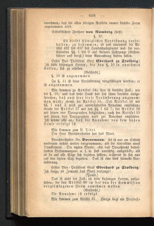 Erster Vice - Präsident Graf Eberhard zn Stolberg:Fch frage/ ob Jemand das Wort verlangt?