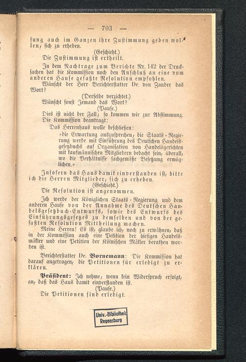 »die Erwartung anszusprcchcn, die Staats - Regie-rung werde mit Einführung des Deutschen Handels-gesetzbuchs auf Organisation von Handelsgerichtenmit kaufmännischen Mitgliedern bedacht sei»/ überall/wo die Verhältnisse sachgemäße Besetzung ermög-lichen.»