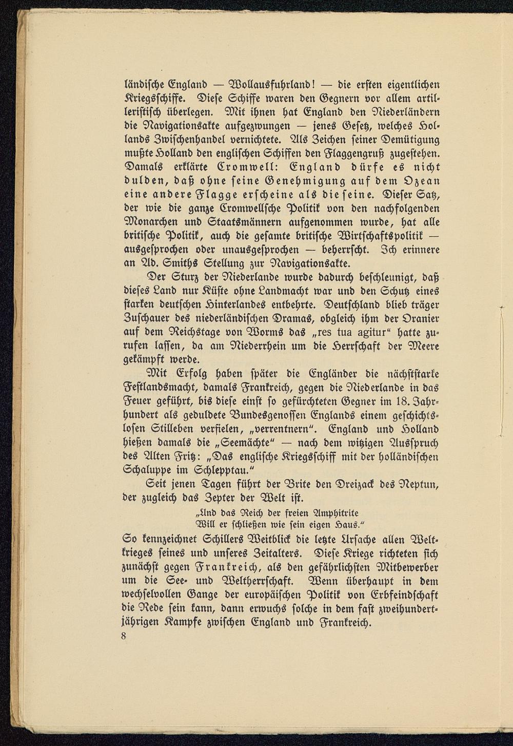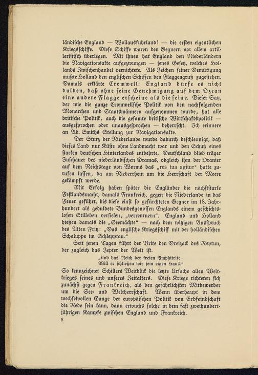 So kennzeichnet Schillers Weitblick die letzte Ursache allen Welt-krieges seines und unseres Zeitalters. Diese Kriege richteten sichzunächst gegen Frankreich , als den gefährlichsten Mitbewerberum die See- und Weltherrschaft. Wenn überhaupt in demwechselvollen Gange der europäischen Politik von Erbfeindschaftdie Rede sein kann, dann erwuchs solche in dem fast zweihundert-jährigen Kampfe zwischen England und Frankreich .