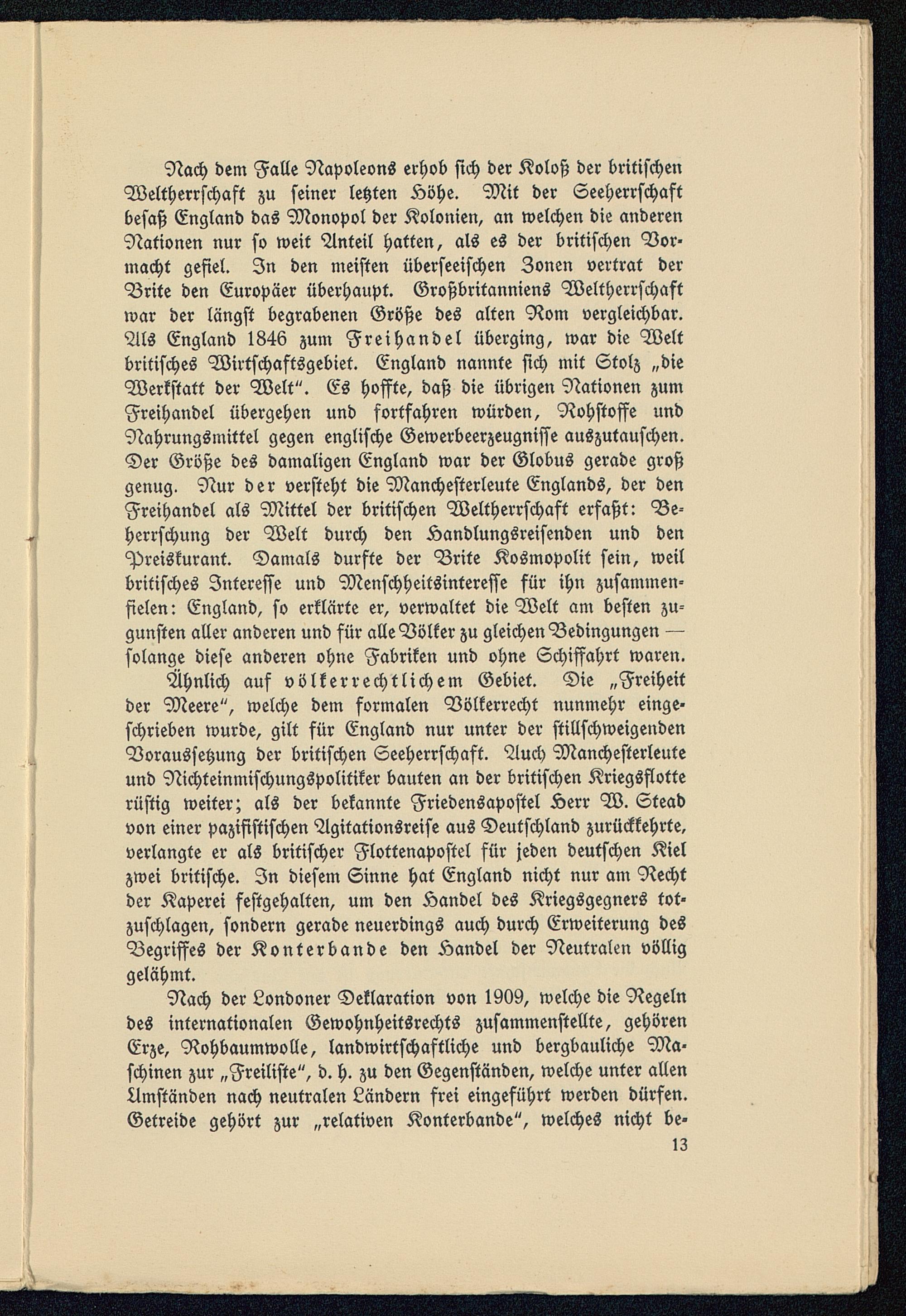 Ähnlich auf völkerrechtlichem Gebiet. Die „Freiheitder Meere", welche dem formalen Völkerrecht nunmehr einge-schrieben wurde, gilt für England nur unter der stillschweigendenVoraussetzung der britischen Seeherrschaft. Auch Manchesterleuteund Nichteinmischungspolitiker bauten an der britischen Kriegsflotterüstig weiter; als der bekannte Friedensapostel Herr W. Steadvon einer pazifistischen Agitationsreise aus Deutschland zurückkehrte,verlangte er als britischer Flottenapostel für jeden deutschen Kiel zwei britische. In diesem Sinne hat England nicht nur am Rechtder Kaperei festgehalten, um den Handel des Kriegsgegners tot-zuschlagen, sondern gerade neuerdings auch durch Erweiterung desBegriffes der Konterbande den Handel der Neutralen völliggelähmt.