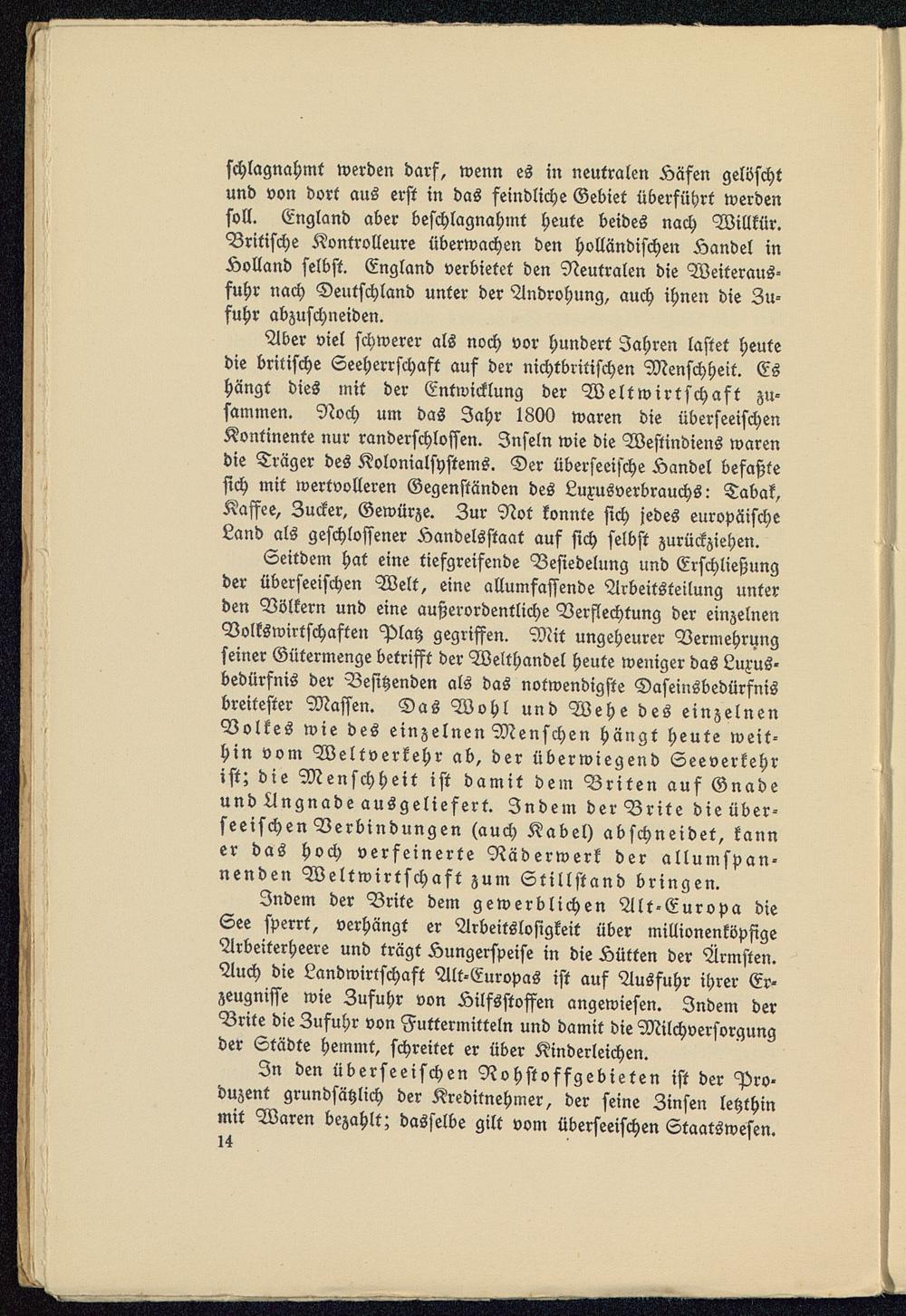 Indem der Brite dem gewerblichen Alt-Europa dieSee sperrt, verhängt er Arbeitslosigkeit über millionenköpfigeArbeiterheere und trägt Kungerspeise in die Kütten der Ärmsten.Auch die Landwirtschaft Alt-Europas ist auf Ausfuhr ihrer Er-zeugnisse wie Zufuhr von Kilfsstoffen angewiesen. Indem derBrite die Zufuhr von Futtermitteln und damit die Milchversorgungder Städte hemmt, schreitet er über Kinderleichen.