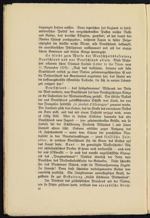 So bleibt zum Werke der MenschheitsbefreiungDeutschland und nur Deutschland allein. Diese Wahr-heit erkannte schon Thomas Carlyle (Better to tke limes vomlI.November 1870): »Daß das duldsame, fromme und festeDeutschland endlich zu einer Nation zusammengeschmolzen ist unddie Vorherrschaft des Kontinentes angetreten hat, das scheint mirdie hoffnungsvollste öffentliche Tatsache, die sich in meiner Lebens-zeit ereignet hat."