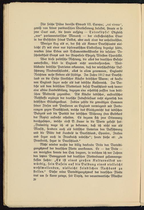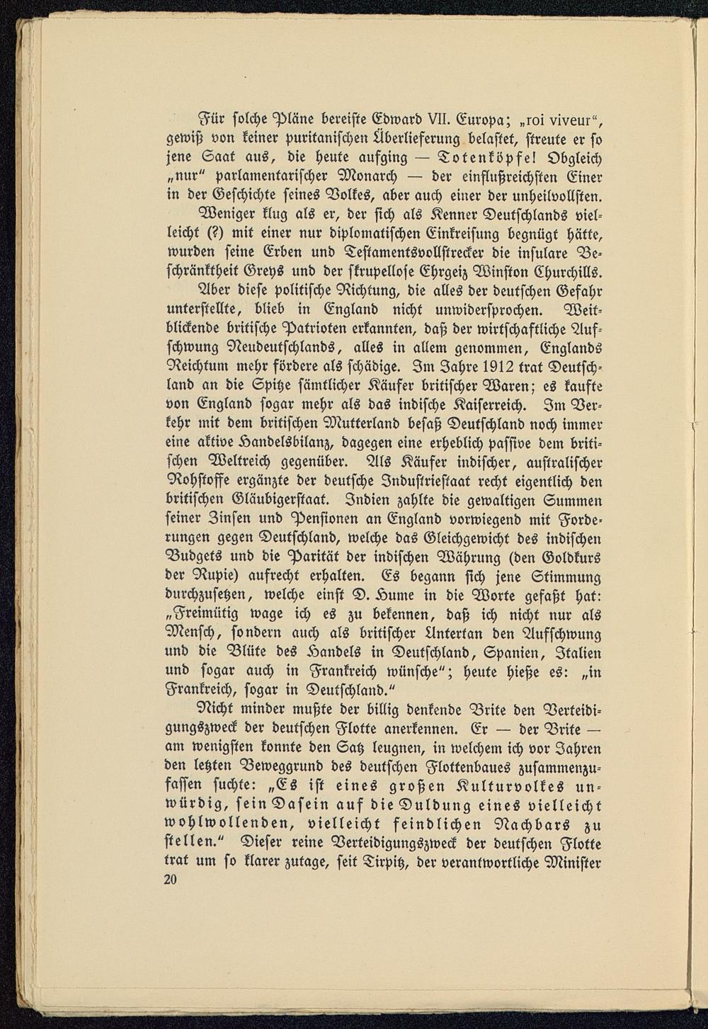 Nicht minder mußte der billig denkende Brite den Verteidi-gungszweck der deutschen Flotte anerkennen. Er — der Brite —am wenigsten konnte den Satz leugnen, in welchem ich vor Jahrenden letzten Beweggrund des deutschen Flottenbaues zusammenzu-fassen suchte: „Es ist eines großen Kulturvolkes un-würdig, seinDasein auf dieDuldung eines vielleichtwohlwollenden, vielleicht feindlichen Nachbars zustellen." Dieser reine Verteidigungszweck der deutschen Flottetrat um so klarer zutage, seit Tirpitz, der verantwortliche Minister20
