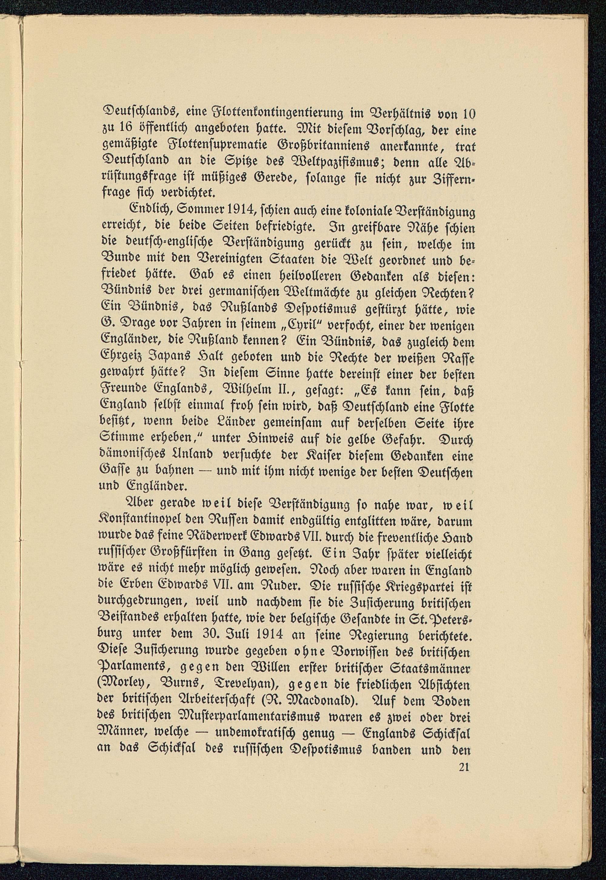 Aber gerade weil diese Verständigung so nahe war, weilKonstantinopel den Russen damit endgültig entglitten wäre, darumwurde das feine Räderwerk Edwards VII. durch die freventliche Handrussischer Großfürsten in Gang gesetzt. Ein Jahr später vielleichtwäre es nicht mehr möglich gewesen. Noch aber waren in England die Erben Edwards VII. am Ruder. Die russische Kriegspartei istdurchgedrungen, weil und nachdem sie die Zusicherung britischenBeistandes erhalten hatte, wie der belgische Gesandte in St.Peters-burg unter dem 30. Juli 1914 an seine Regierung berichtete.Diese Zusicherung wurde gegeben ohne Vorwissen des britischenParlaments, gegen den Willen erster britischer Staatsmänner(Morley, Burns, Trevelyan), gegen die friedlichen Absichtender britischen Arbeiterschaft (R. Macdonald). Auf dem Bodendes britischen Musterparlamentarismus waren es zwei oder dreiMänner, welche — undemokratisch genug — Englands Schicksalan das Schicksal des russischen Despotismus banden und den