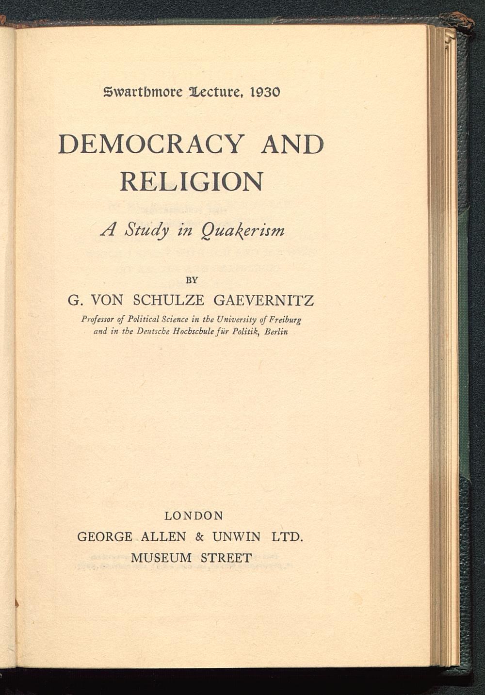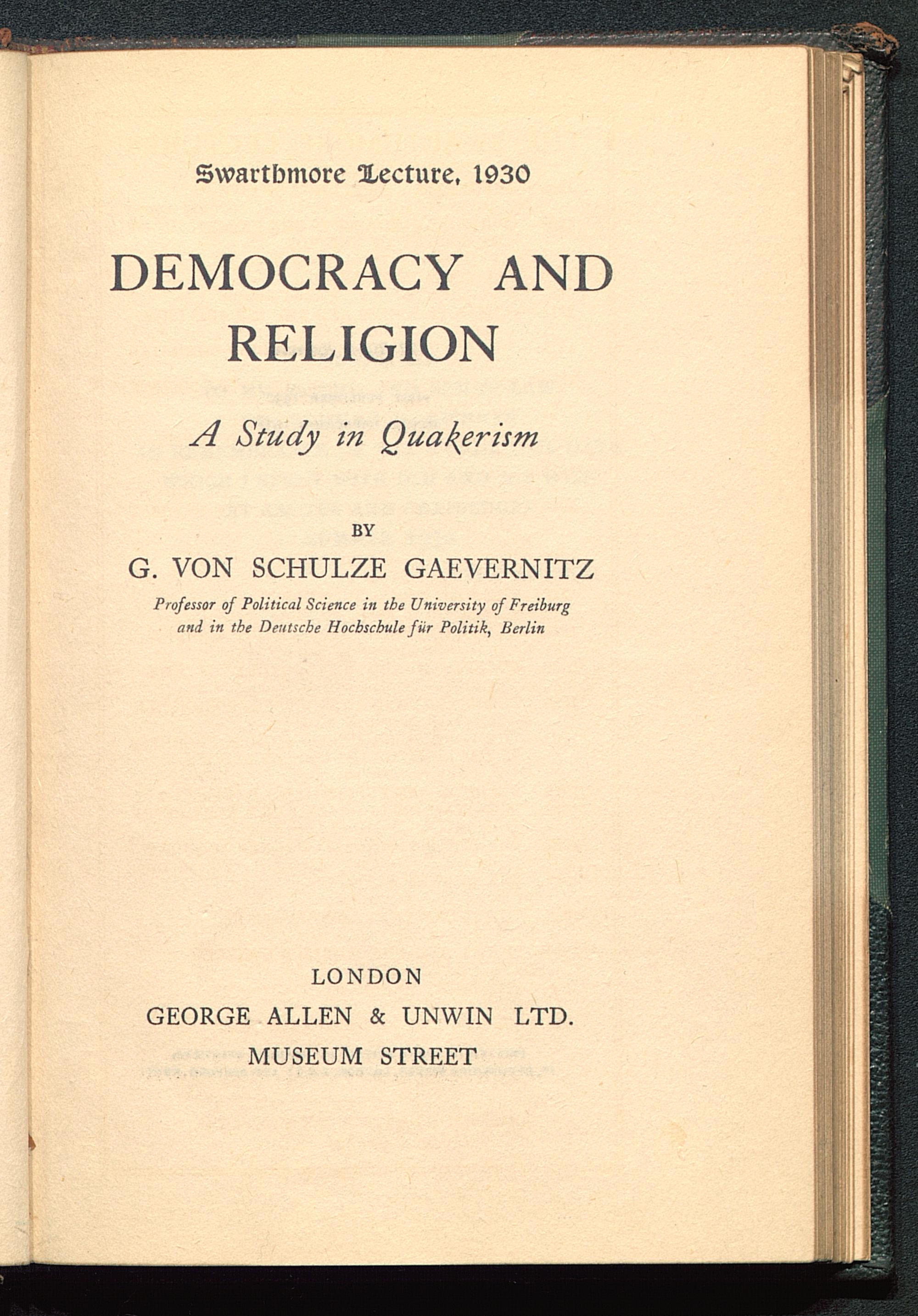 Swartbmore Xecture, 1930DEMOCRACY ANDRELIGIONA Study in QuakerismBYG. VON SCHULZE GAEVERNITZProfessor of Political Science in the University of Freiburg and in the Deutsche Hocbschule fur Politik, Berlin LONDON GEORGE ALLEN & UNWIN LTD.MUSEUM STREET