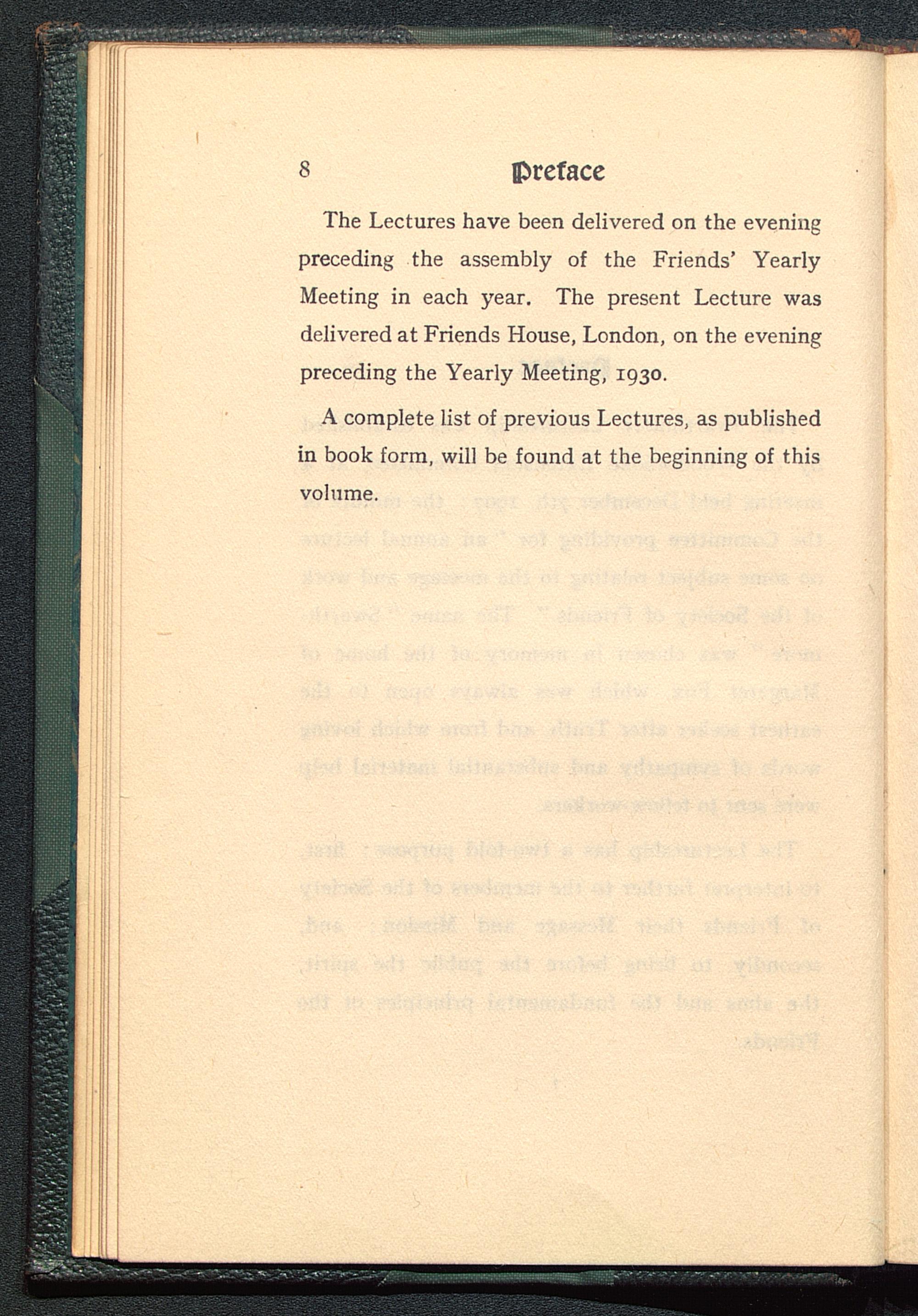 The Lectures have been delivered on the eveningpreceding the assembly of the Friends' YearlyMeeting in each year. The present Lecture wasdelivered at Friends House, London , on the eveningpreceding the Yearly Meeting, 1930.