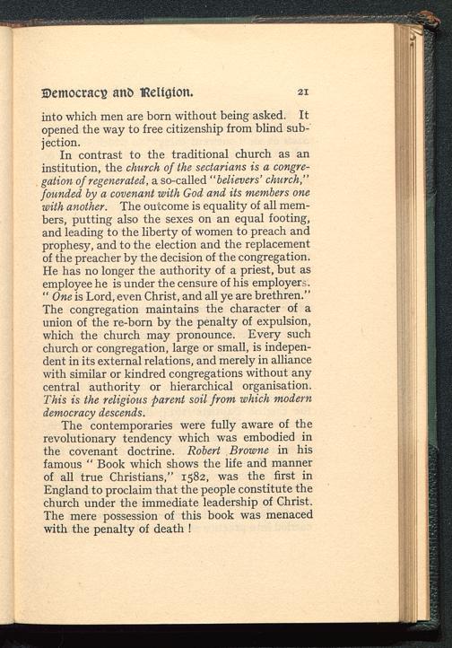 The contemporaries were fully aware of therevolutionary tendency which was embodied inthe covenant doctrine. Robert Browne in hisfamous " Book which shows the life and mannerof all true Christians," 1582, was the first inEngland to proclaim that the people constitute thechurch under the immediate leadership of Christ.The mere possession of this book was menacedwith the penalty of death !