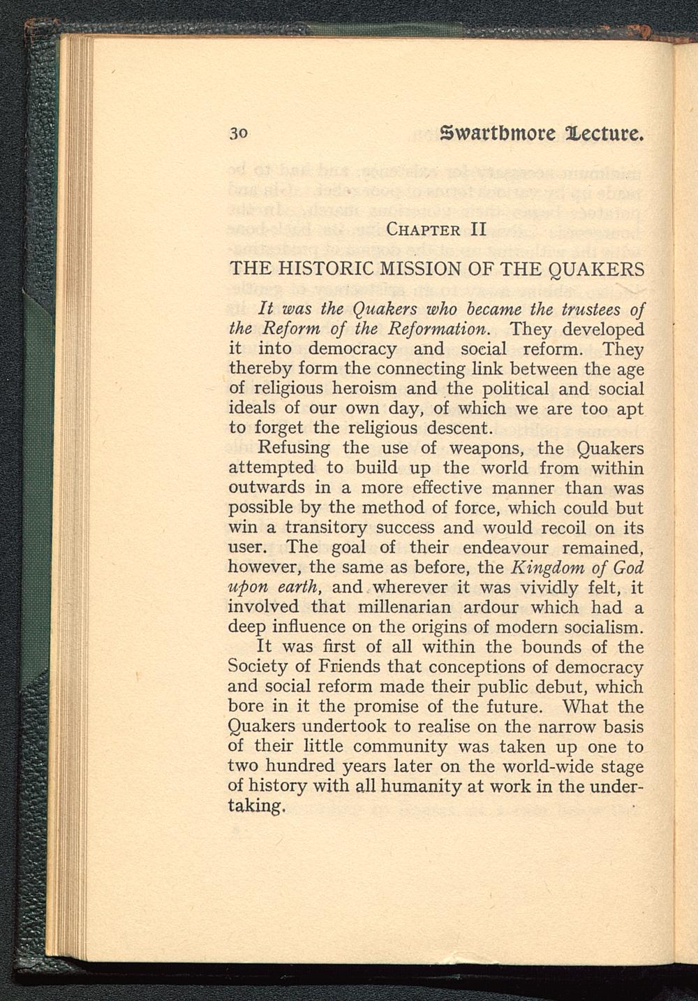Refusing the use of weapons, the Quakersattempted to build up the world from withinoutwards in a more effective manner than waspossible by the method of force, which could butwin a transitory success and would recoil on itsuser. The goal of their endeavour remained,however, the same as before, the Kingdom of Godupon earth, and wherever it was vividly felt, itinvolved that millenarian ardour which had adeep influence on the origins of modern socialism.