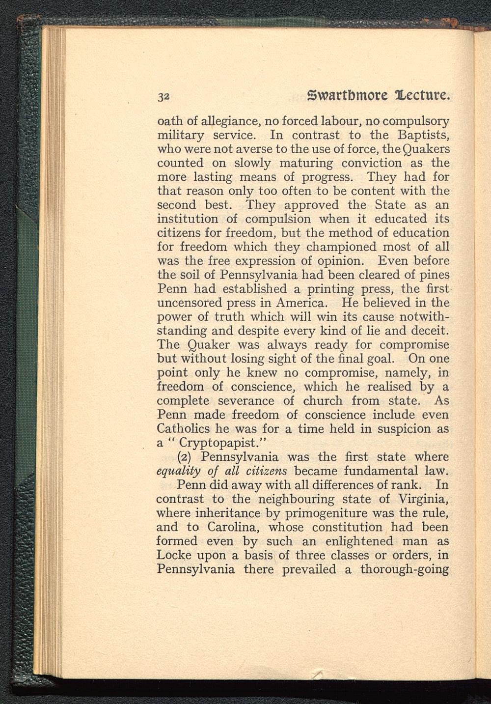 Penn did away with all differences of rank. Incontrast to the neighbouring state of Virginia,where inheritance by primogeniture was the rule,and to Carolina, whose constitution had beenformed even by such an enlightened man asLocke upon a basis of three classes or orders, inPennsylvania there prevailed a thorough-going