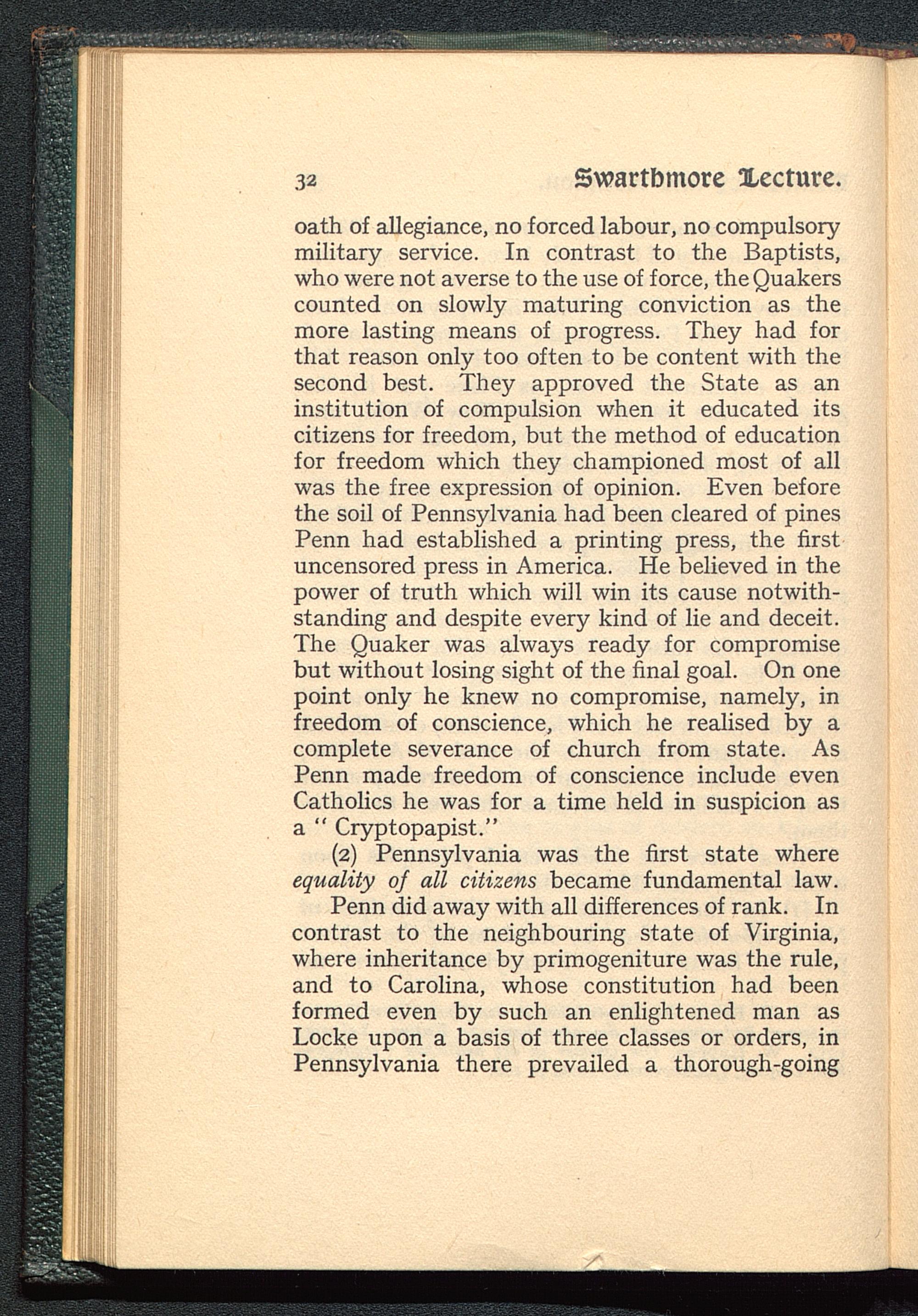 oath of allegiance, no forced labour, no compulsorymilitary service. In contrast to the Baptists ,who were not averse to the use of force, the Quakerscounted on slowly maturing conviction as themore lasting means of progress. They had forthat reason only too often to be content with thesecond best. They approved the State as aninstitution of compulsion when it educated itscitizens for freedom, but the method of educationfor freedom which they championed most of allwas the free expression of opinion. Even beforethe soil of Pennsylvania had been cleared of pinesPenn had established a printing press, the firstuncensored press in America . He believed in thepower of truth which will win its cause notwith-standing and despite every kind of lie and deceit.The Quaker was always ready for compromisebut without losing sight of the final goal. On onepoint only he knew no compromise, namely, infreedom of conscience, which he realised by acomplete severance of church from state. AsPenn made freedom of conscience include evenCatholics he was for a time held in suspicion asa " Cryptopapist."