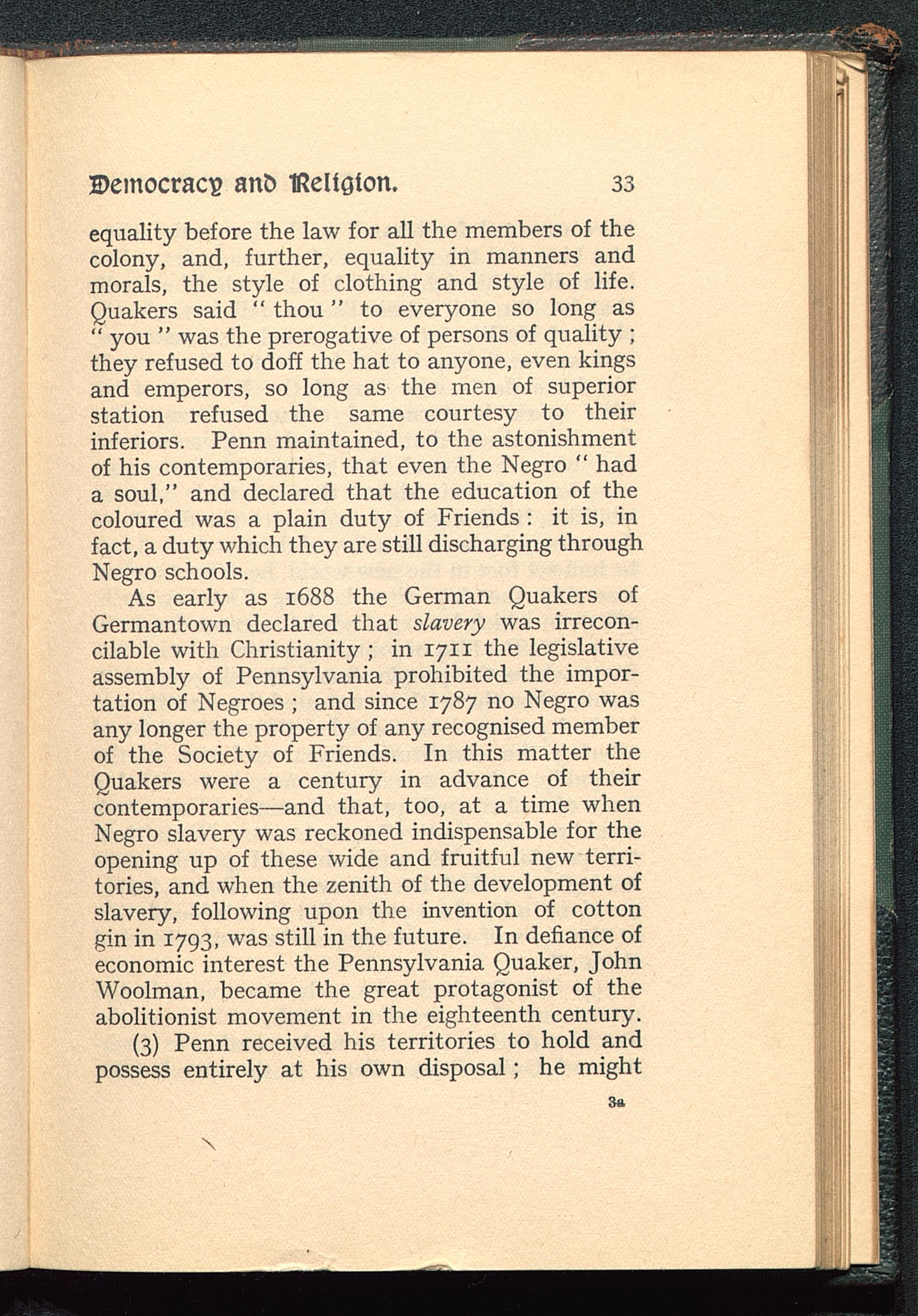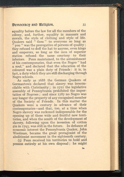 equality before the law for all the members of thecolony, and, further, equality in manners andmorals, the style of clothing and style of life.Quakers said " thou " to everyone so long as" you " was the prerogative of persons of quality ;they refused to doff the hat to anyone, even kingsand emperors, so long as the men of superiorstation refused the same courtesy to theirinferiors. Penn maintained, to the astonishmentof his contemporaries, that even the Negro " hada soul," and declared that the education of thecoloured was a plain duty of Friends : it is, infact, a duty which they are still discharging throughNegro schools.