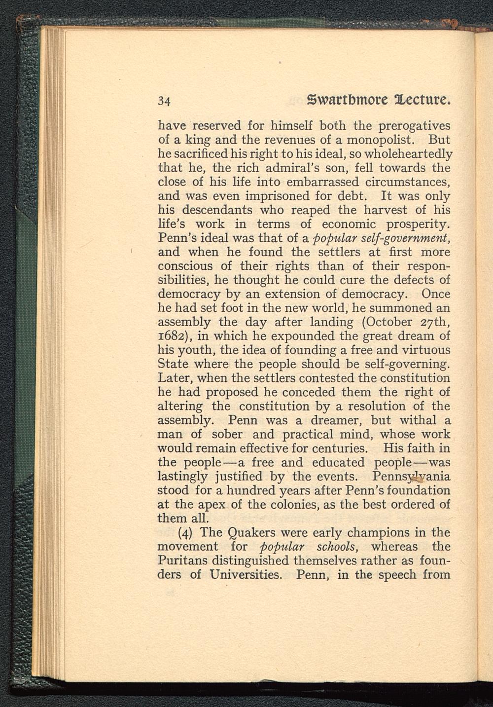(4) The Quakers were early champions in themovement for popular schools, whereas thePuritans distinguished themselves rather as foun-ders of Universities. Penn, in the speech from