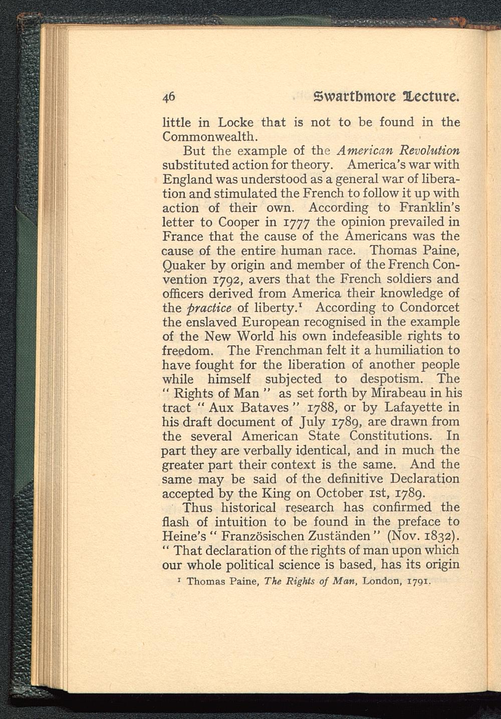 But the example of the American Revolution substituted action for theory. America' s war withEngland was understood as a general war of libera-tion and stimulated the French to follow it up withaction of their own. According to Franklin'sletter to Cooper in 1777 the opinion prevailed inFrance that the cause of the Americans was thecause of the entire human race. Thomas Paine, Quaker by origin and member of the French Con-vention 1792, avers that the French soldiers andofficers derived from America their knowledge ofthe practice of liberty. 1 According to Condorcet the enslaved European recognised in the exampleof the New World his own indefeasible rights tofreedom. The Frenchman felt it a humiliation tohave fought for the liberation of another peoplewhile himself subjected to despotism. The" Rights of Man " as set forth by Mirabeau in histract " Aux Bataves " 1788, or by Lafayette inhis draft document of July 1789, are drawn fromthe several American State Constitutions. Inpart they are verbally identical, and in much thegreater part their context is the same. And thesame may be said of the definitive Declarationaccepted by the King on October 1st, 1789.