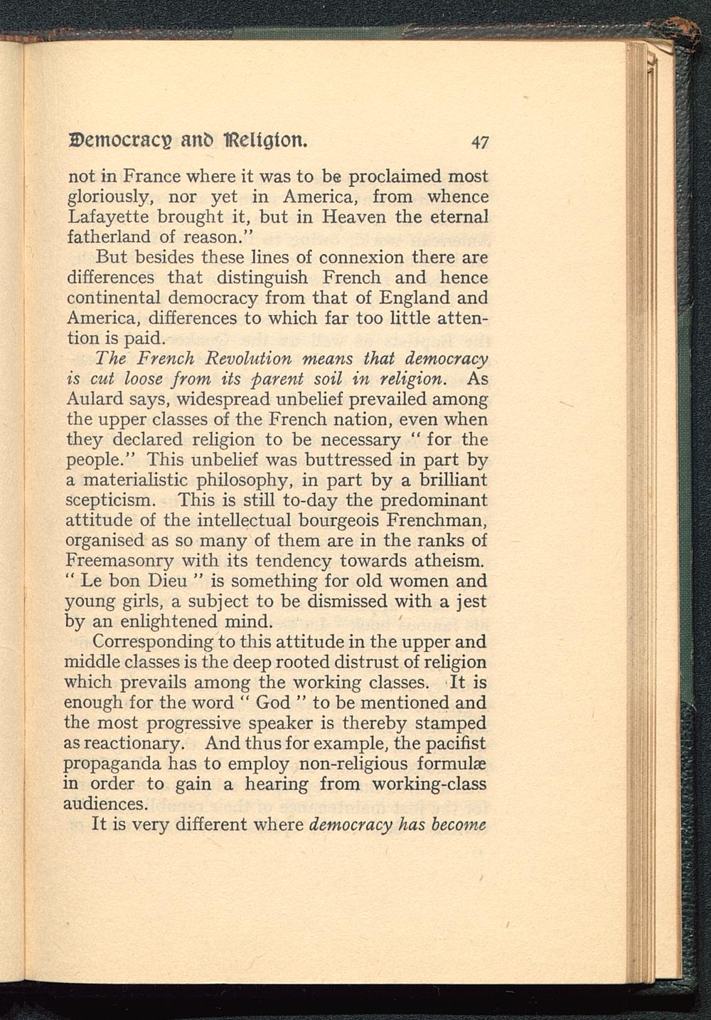 The French Revolution means that democracyis cut loose from its parent soil in religion. AsAulard says, widespread unbelief prevailed amongthe upper classes of the French nation, even whenthey declared religion to be necessary " for thepeople." This unbelief was buttressed in part bya materialistic philosophy, in part by a brilliantscepticism. This is still to-day the predominantattitude of the intellectual bourgeois Frenchman,organised as so many of them are in the ranks ofFreemasonry with its tendency towards atheism." Le bon Dieu " is something for old women andyoung girls, a subject to be dismissed with a jestby an enlightened mind.