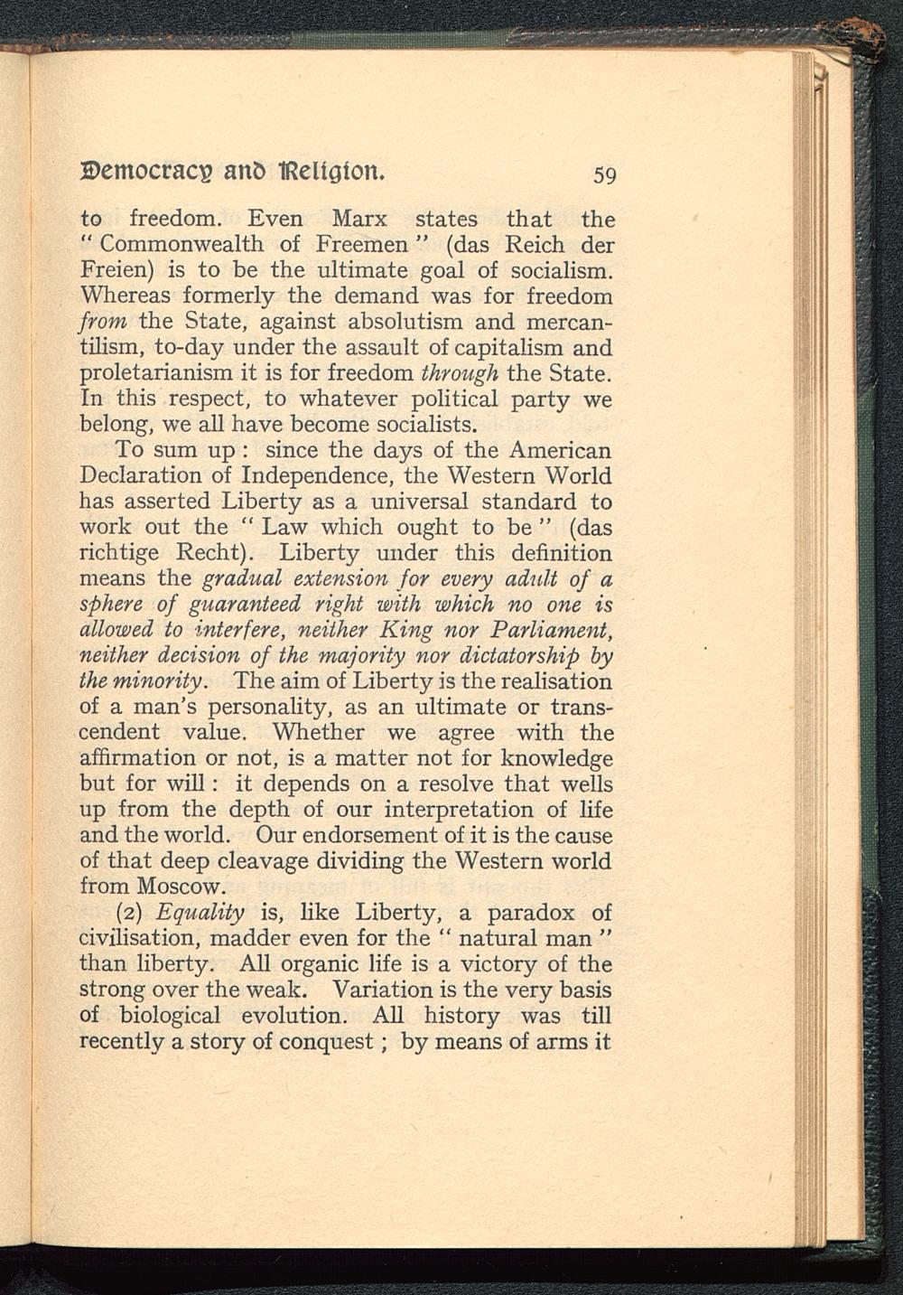To sum up : since the days of the AmericanDeclaration of Independence, the Western Worldhas asserted Liberty as a universal standard towork out the " Law which ought to be " (dasrichtige Recht). Liberty under this definitionmeans the gradual extension for every adult of asphere of guaranteed right with which no one isallowed to interfere, neither King nor Parliament,neither decision of the majority nor dictatorship bythe minority. The aim of Liberty is the realisationof a man's personality, as an ultimate or trans-cendent value. Whether we agree with theaffirmation or not, is a matter not for knowledgebut for will: it depends on a resolve that wellsup from the depth of our interpretation of lifeand the world. Our endorsement of it is the causeof that deep cleavage dividing the Western worldfrom Moscow .