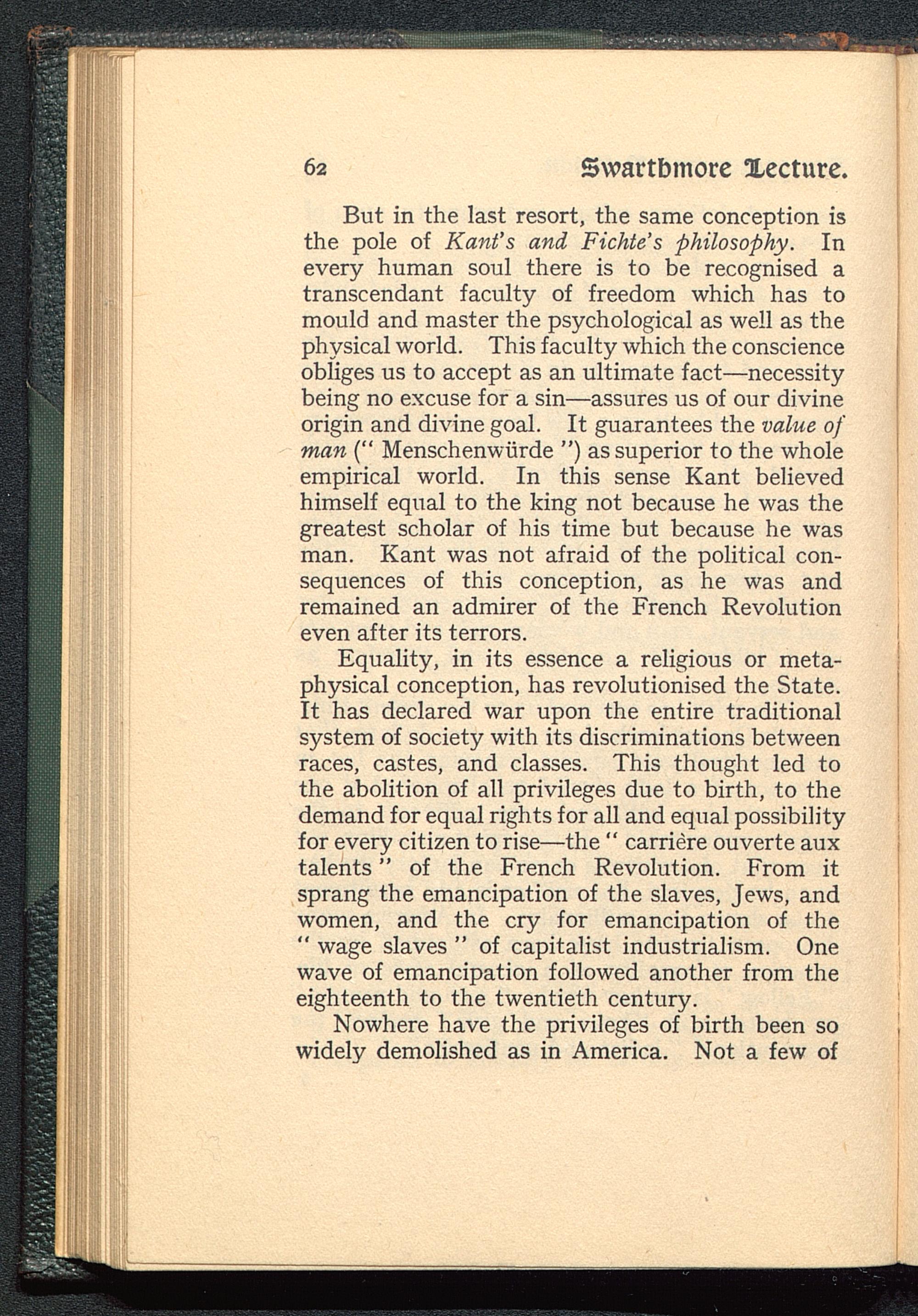 Equality, in its essence a religious or meta-physical conception, has revolutionised the State.It has declared war upon the entire traditionalsystem of society with its discriminations betweenraces, castes, and classes. This thought led tothe abolition of all privileges due to birth, to thedemand for equal rights for all and equal possibilityfor every citizen to rise—the " carriere ouverte auxtalents" of the French Revolution . From itsprang the emancipation of the slaves, Jews , andwomen, and the cry for emancipation of the" wage slaves " of capitalist industrialism. Onewave of emancipation followed another from theeighteenth to the twentieth century.