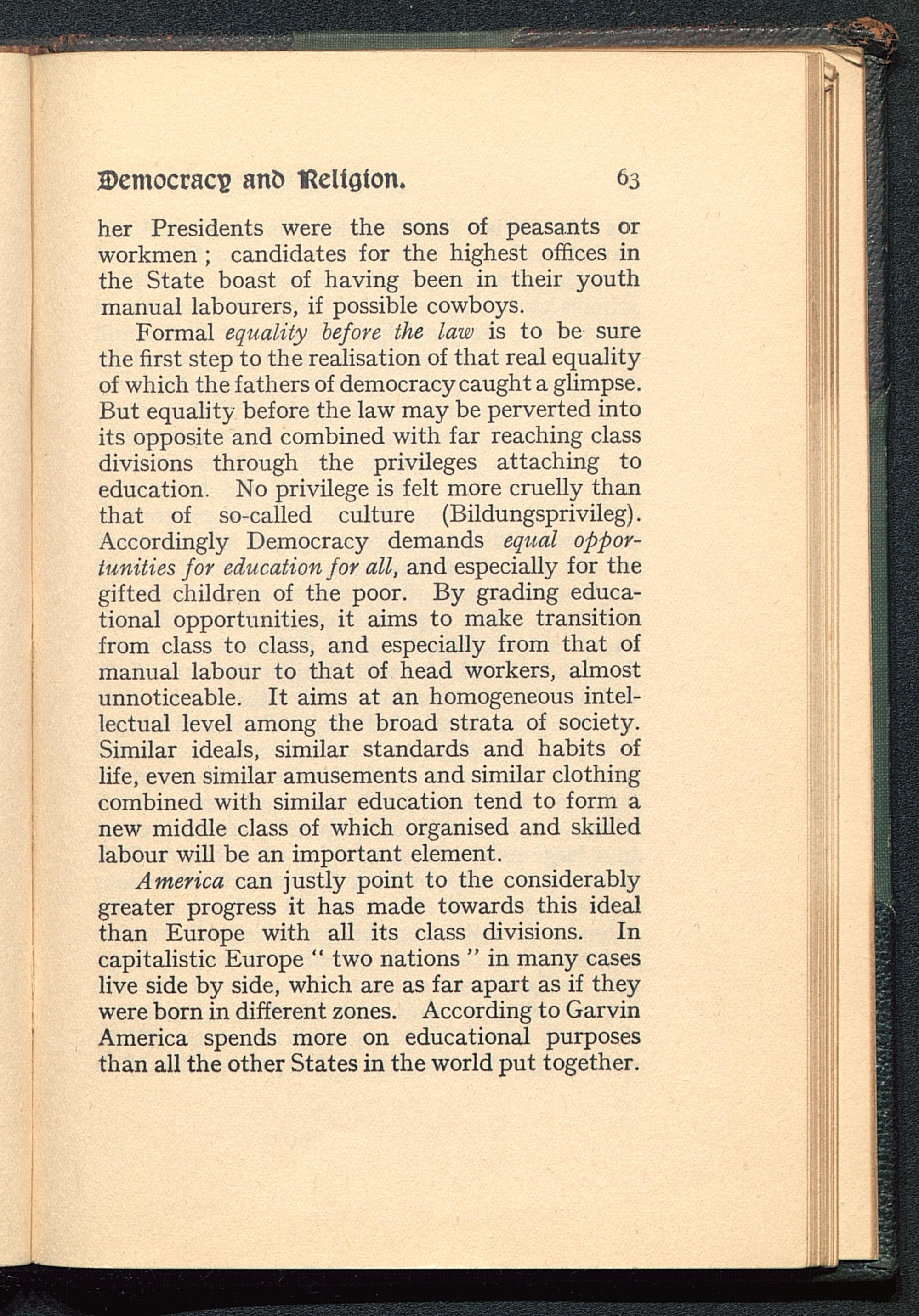 Formal equality before the law is to be surethe first step to the realisation of that real equalityof which the fathers of democracy caught a glimpse.But equality before the law may be perverted intoits opposite and combined with far reaching classdivisions through the privileges attaching toeducation. No privilege is felt more cruelly thanthat of so-called culture (Bildungsprivileg).Accordingly Democracy demands equal oppor-tunities for education for all, and especially for thegifted children of the poor. By grading educa-tional opportunities, it aims to make transitionfrom class to class, and especially from that ofmanual labour to that of head workers, almostunnoticeable. It aims at an homogeneous intel-lectual level among the broad strata of society.Similar ideals, similar standards and habits oflife, even similar amusements and similar clothingcombined with similar education tend to form anew middle class of which organised and skilledlabour will be an important element.