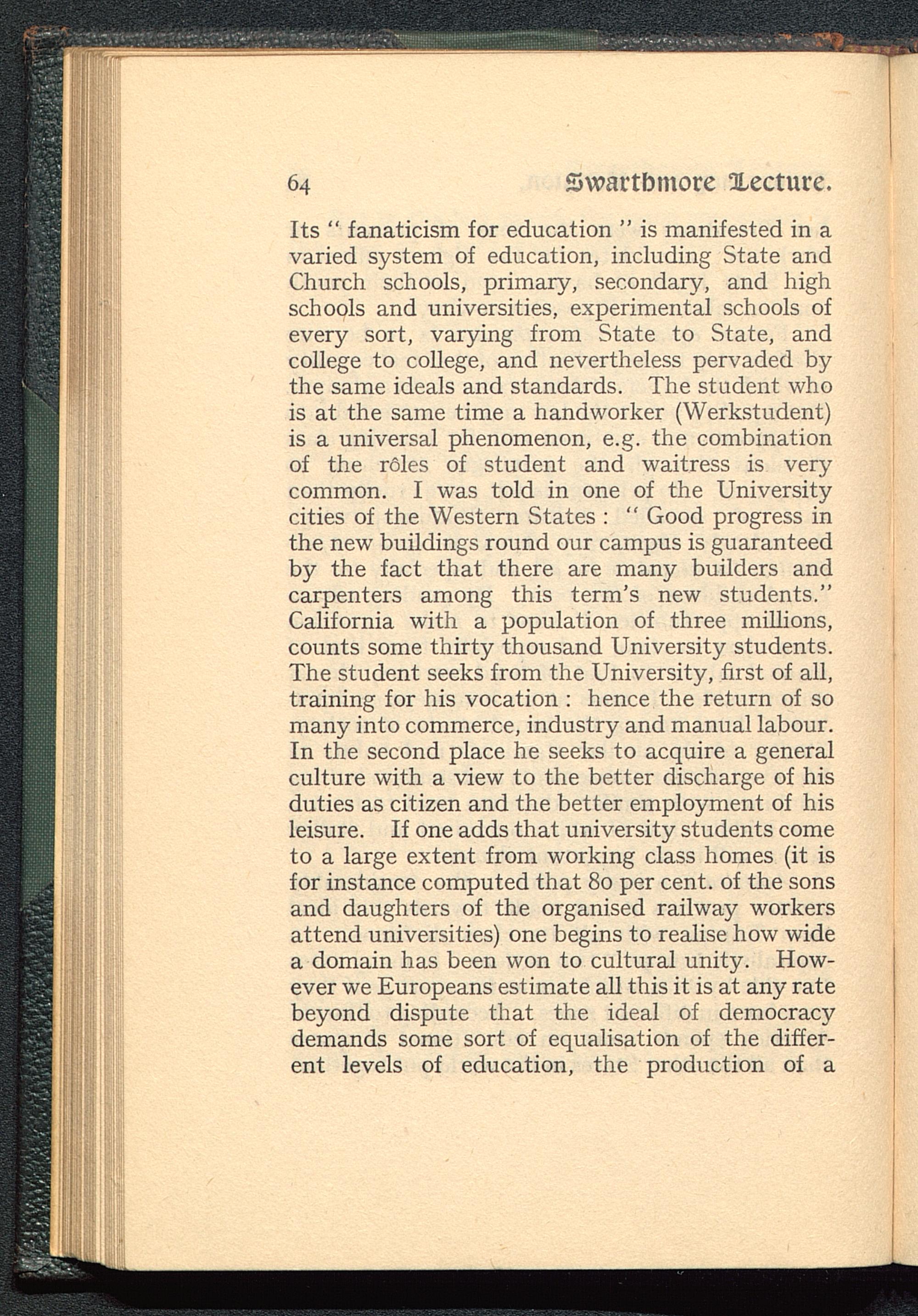 Its " fanaticism for education " is manifested in avaried system of education, including State andChurch schools, primary, secondary, and highschools and universities, experimental schools ofevery sort, varying from State to State, andcollege to college, and nevertheless pervaded bythe same ideals and standards. The student whois at the same time a handworker (Werkstudent )is a universal phenomenon, e.g. the combinationof the roles of student and waitress is verycommon. I was told in one of the University cities of the Western States : " Good progress inthe new buildings round our campus is guaranteedby the fact that there are many builders andcarpenters among this term's new students."California with a population of three millions,counts some thirty thousand University students.The student seeks from the University , first of all,training for his vocation : hence the return of somany into commerce, industry and manual labour.In the second place he seeks to acquire a generalculture with a view to the better discharge of hisduties as citizen and the better employment of hisleisure. If one adds that university students cometo a large extent from working class homes (it isfor instance computed that 80 per cent, of the sonsand daughters of the organised railway workersattend universities) one begins to realise how widea domain has been won to cultural unity. How-ever we Europeans estimate all this it is at any ratebeyond dispute that the ideal of democracydemands some sort of equalisation of the differ-ent levels of education, the production of a