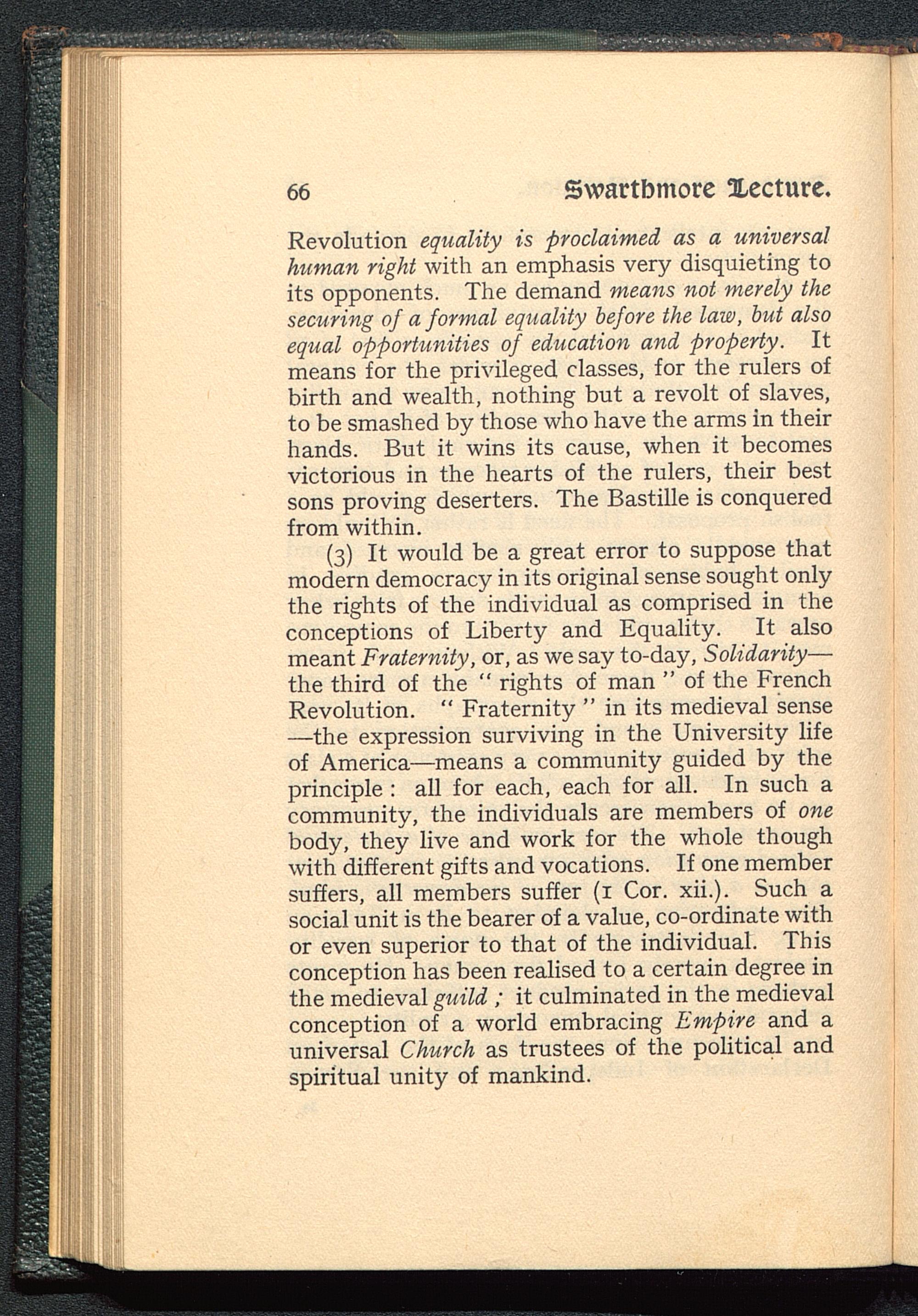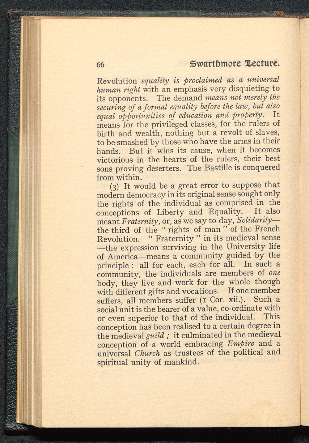 (3) It would be a great error to suppose thatmodern democracy in its original sense sought onlythe rights of the individual as comprised in theconceptions of Liberty and Equality. It alsomeant Fraternity , or, as we say to-day, Solidarity—the third of the " rights of man " of the FrenchRevolution. " Fraternity " in its medieval sense—the expression surviving in the University lifeof America—means a community guided by theprinciple : all for each, each for all. In such acommunity, the individuals are members of onebody, they live and work for the whole thoughwith different gifts and vocations. If one membersuffers, all members suffer (1 Cor. xii.). Such asocial unit is the bearer of a value, co-ordinate withor even superior to that of the individual. Thisconception has been realised to a certain degree inthe medieval guild ; it culminated in the medievalconception of a world embracing Empire and auniversal Church as trustees of the political andspiritual unity of mankind.
