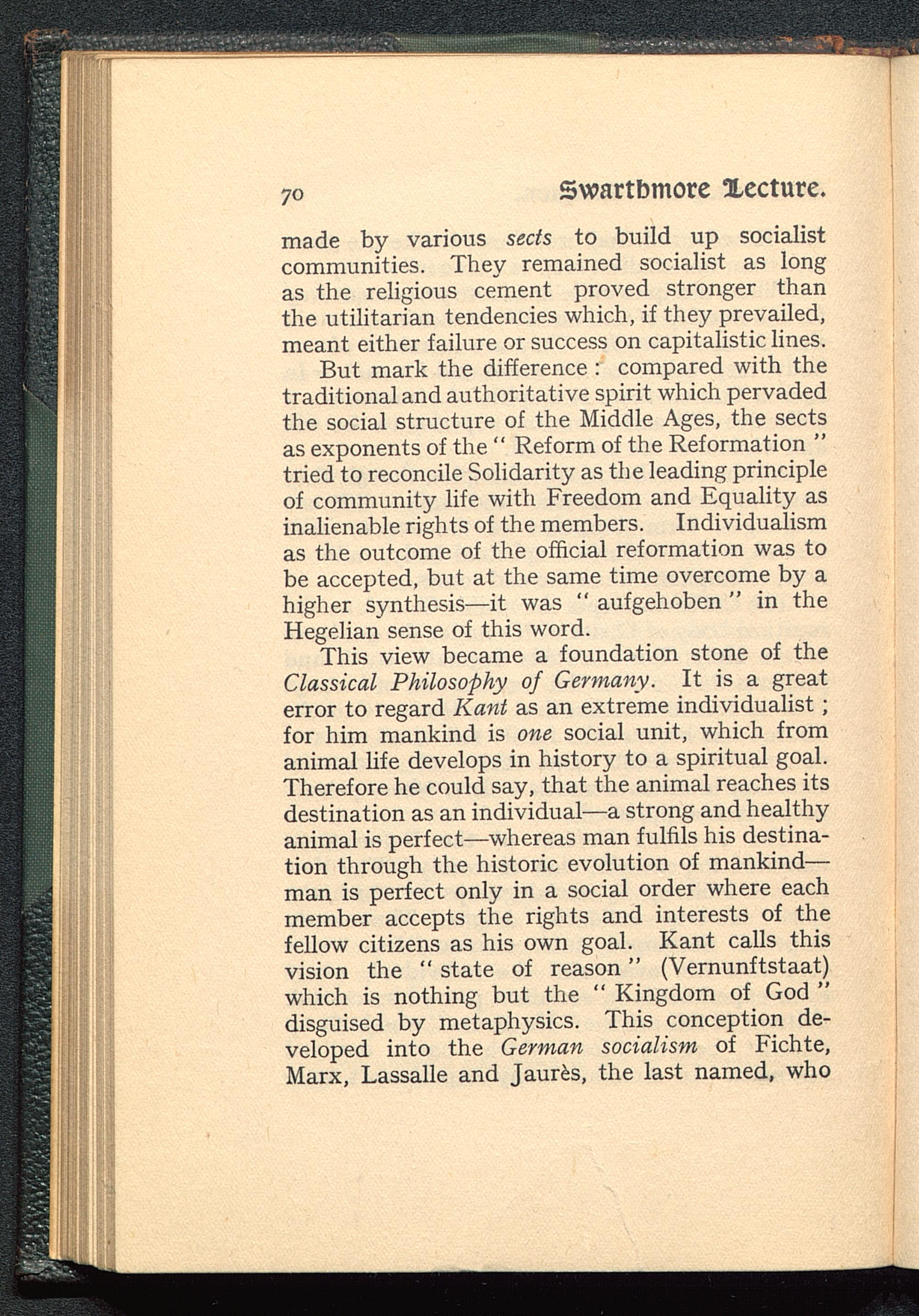 This view became a foundation stone of theClassical Philosophy of Germany. It is a greaterror to regard Kant as an extreme individualist ;for him mankind is one social unit, which fromanimal life develops in history to a spiritual goal.Therefore he could say, that the animal reaches itsdestination as an individual—a strong and healthyanimal is perfect—whereas man fulfils his destina-tion through the historic evolution of mankind—man is perfect only in a social order where eachmember accepts the rights and interests of thefellow citizens as his own goal. Kant calls thisvision the " state of reason" (Vernunftstaat)which is nothing but the " Kingdom of God "disguised by metaphysics. This conception de-veloped into the German socialism of Fichte ,Marx , Lassalle and Jaurte, the last named, who