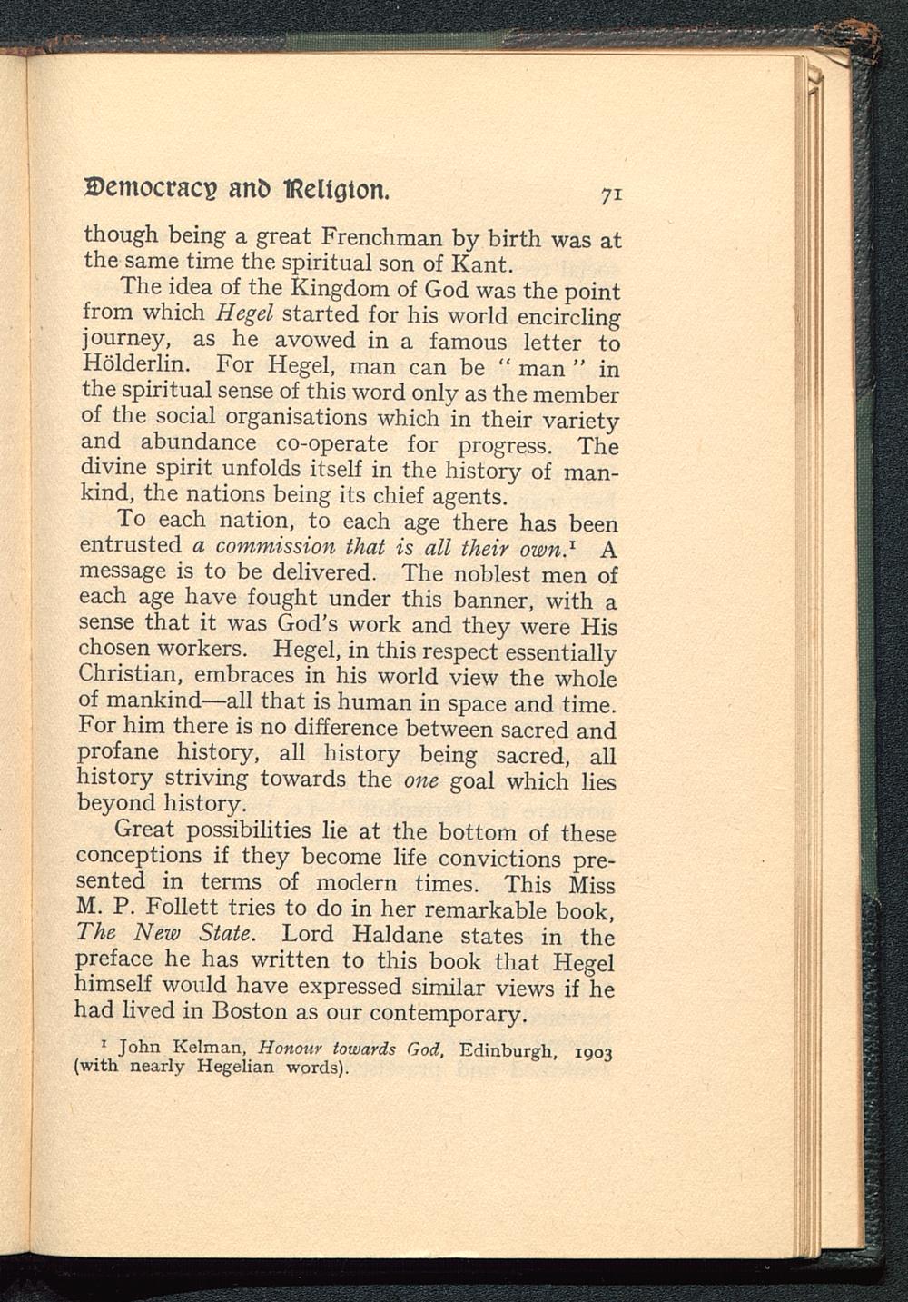 Great possibilities lie at the bottom of theseconceptions if they become life convictions pre-sented in terms of modern times. This MissM. P. Follett tries to do in her remarkable book,The New State. Lord Haldane states in thepreface he has written to this book that Hegel himself would have expressed similar views if hehad lived in Boston as our contemporary.