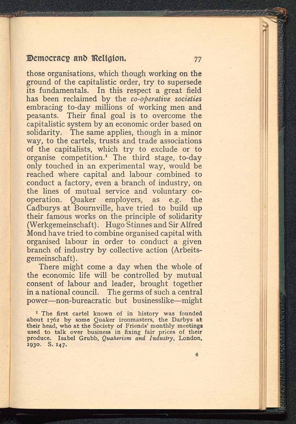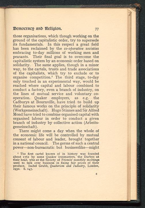 1 The first cartel known of in history was foundedabout 1762 by some Quaker ironmasters, the Darbys attheir head, who at the Society of Friends ' monthly meetingsused to talk over business in fixing fair prices of theirproduce. Isabel Grubb, Quakerism and Industry, London ,1930. S. 147.