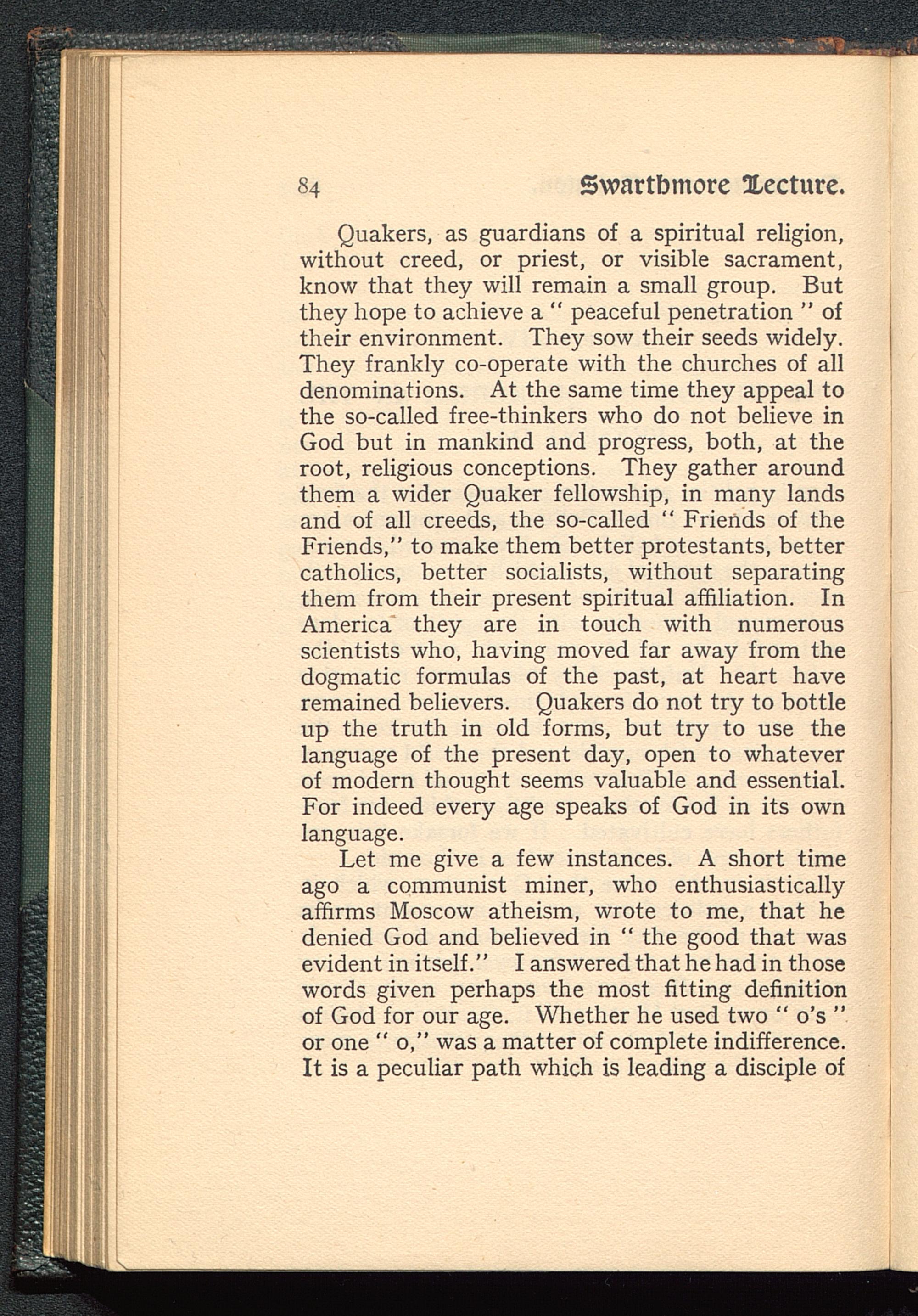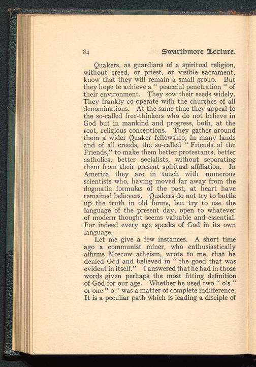 Quakers, as guardians of a spiritual religion,without creed, or priest, or visible sacrament,know that they will remain a small group. Butthey hope to achieve a " peaceful penetration " oftheir environment. They sow their seeds widely.They frankly co-operate with the churches of alldenominations. At the same time they appeal tothe so-called free-thinkers who do not believe inGod but in mankind and progress, both, at theroot, religious conceptions. They gather aroundthem a wider Quaker fellowship, in many landsand of all creeds, the so-called " Friends of theFriends," to make them better protestants, bettercatholics, better socialists, without separatingthem from their present spiritual affiliation. InAmerica they are in touch with numerousscientists who, having moved far away from thedogmatic formulas of the past, at heart haveremained believers. Quakers do not try to bottleup the truth in old forms, but try to use thelanguage of the present day, open to whateverof modern thought seems valuable and essential.For indeed every age speaks of God in its ownlanguage.