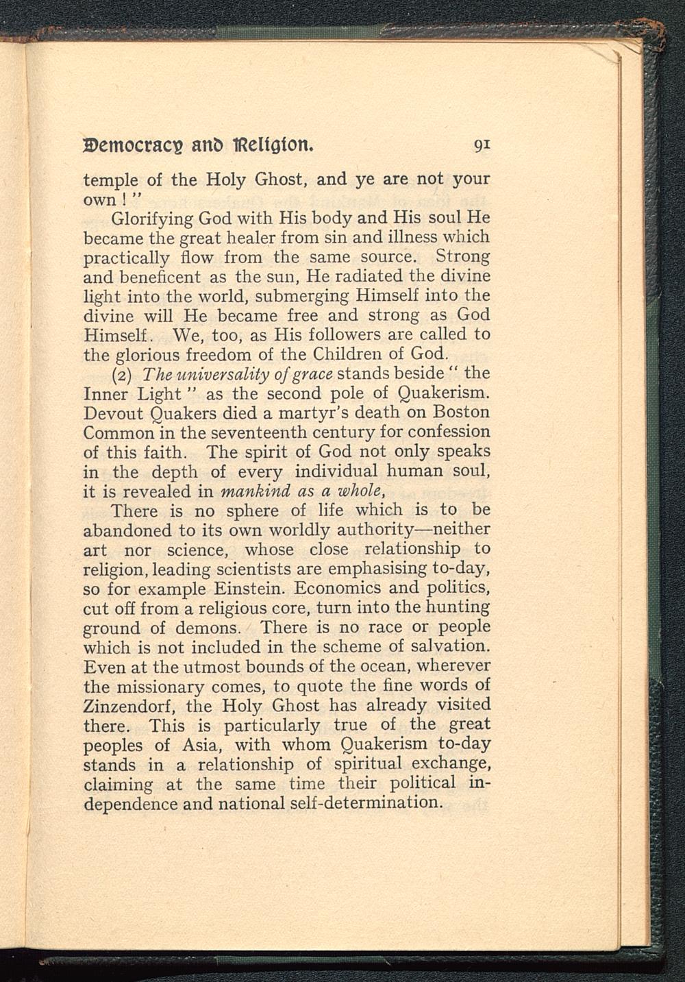 (2) The universality of grace stands beside " theInner Light " as the second pole of Quakerism.Devout Quakers died a martyr's death on BostonCommon in the seventeenth century for confessionof this faith. The spirit of God not only speaksin the depth of every individual human soul,it is revealed in mankind as a whole,
