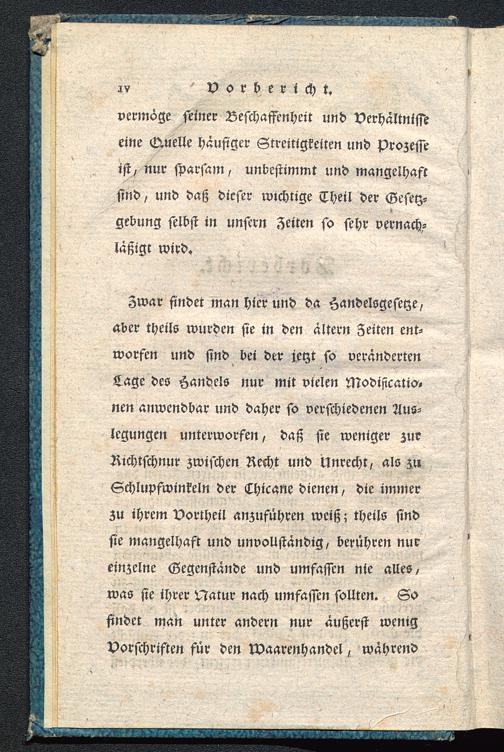 Zwar findet man hier und da Handelsgesetze,aber theils wurden sie in den ältern Zeiten ent-worfen und find bei der jetzt so verändertenLage des Handels nur mit vielen Modificatio.nen anwendbar und daher so verschiedenen Aus-legungen unterworfen, daß sie weniger zurRichtschnur zwischen Recht und Unrecht, als zuSchlupfwinkeln der Chicane dienen, die immerzu ihrem Vortheil anzuführen weiß; theils sindsie mangelhaft und unvollständig, berühren nureinzelne Gegenstände und umfassen nie alles,was sie ihrer Natur nach umfassen sollten. Sofindet man unter andern nur äußerst wenigVorschriften für den waarenhandel, während