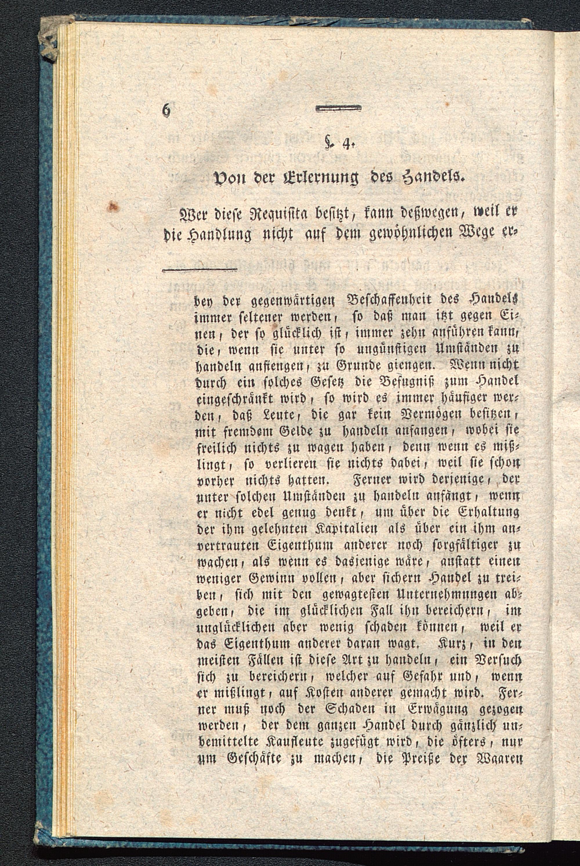 bey der gegenwärtigen Beschaffenheit des Handel-immer seltener werden, so daß man itzt gegen Ei-nen , der so glücklich ist, immer zehn anführen kann,die, wenn sie unter so ungünstigen Umstanden zuhandeln qnfiengen, zu Grunde giengen. Wenn nichtdurch ein solches Gesetz die Befugnis? zum Handeleingeschränkt wird, so wird es immer häufiger wer-den, daß Leute, die gar kein Vermögen besitzen,mit fremdem Gelde zu handeln ansangen, wobei siefreilich nichts zu wagen haben, denn wenn es miß-lingt , so verliere» sie nichts dabei, weil sie schonvorher nichts hatten. Ferner wird derjenige, derunter solchen Umstanden zu bandeln anfängt, wen»er nicht edel genug denkt, um über die Erhaltungder ihm gelehnten Kapitalien als über ein ihm an-vertrauten Eigenthum anderer noch sorgfältiger zuwachen, als wenn es dasjenige wäre, anstatt einenweniger Gewinn vollen, aber sichern Hanhel zu trei-ben , sich mit den gewagtesten Unternehmnngen ab-geben, die im glücklichen Fall ihn bereichern, inrunglücklichen aber wenig schaden können, weil erdas Eigenthum anderer daran wagt. Kur;, in denmeisten Fällen ist diese Art zu handeln, ein Versuchsich zu bereichern, welcher auf Gefahr und, wenner mißlingt, aus Kosten anderer gemacht wird. Fer-ner muß noch der Schaden in Erwägung gezogenwerden, der dem ganzen Handel durch gänzlich un-bemittelte Kaufleute zugefügt wird, die öfters, nurum Geschäfte zu machen, die Preiste der Waaren