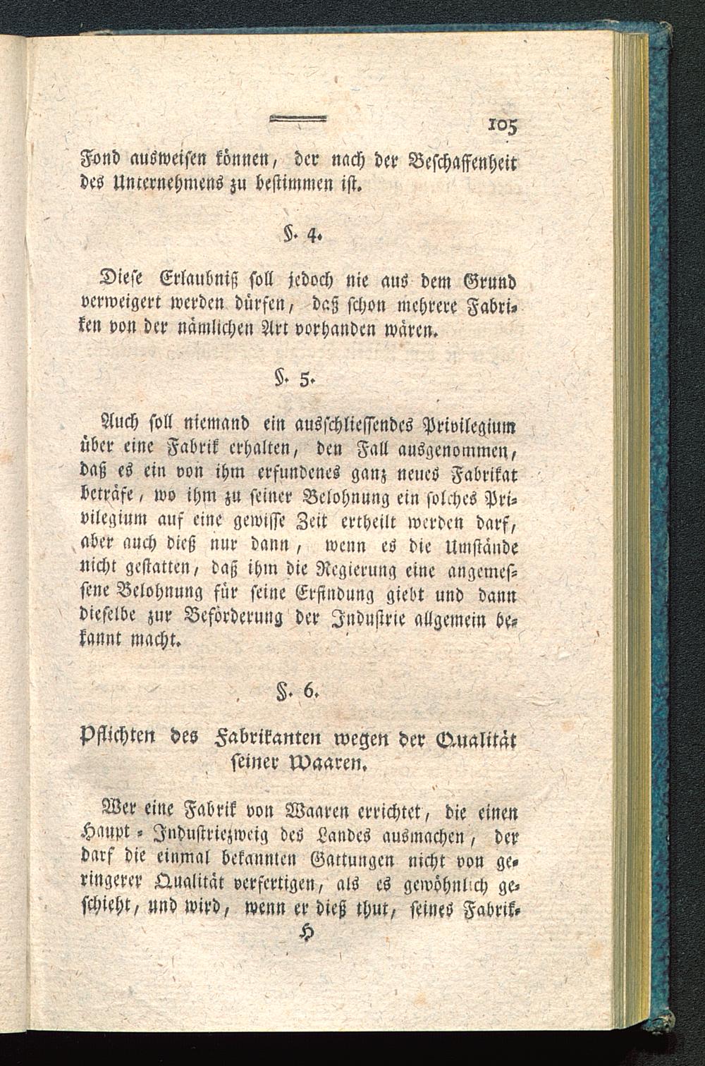 Auch soll niemand ein ausschließendes Privilegiumüber eine Fabrik erhalten, den Fall ausgenommen,daß es ein von ihm erfundenes ganz neues Fabrikatbcträfe, wo ihm zu seiner Belohnung ein solches Pri-vilegium auf eine gewisse Zeit ertheilt werden darf,aber auch dieß nur bann, wenn es die Umständenicht gestatten, daß ihin die Regierung eine angemes-sene Belohnung für seine Erfindung giebt und danndieselbe zur Beförderung der Industrie allgemein be-kannt macht.