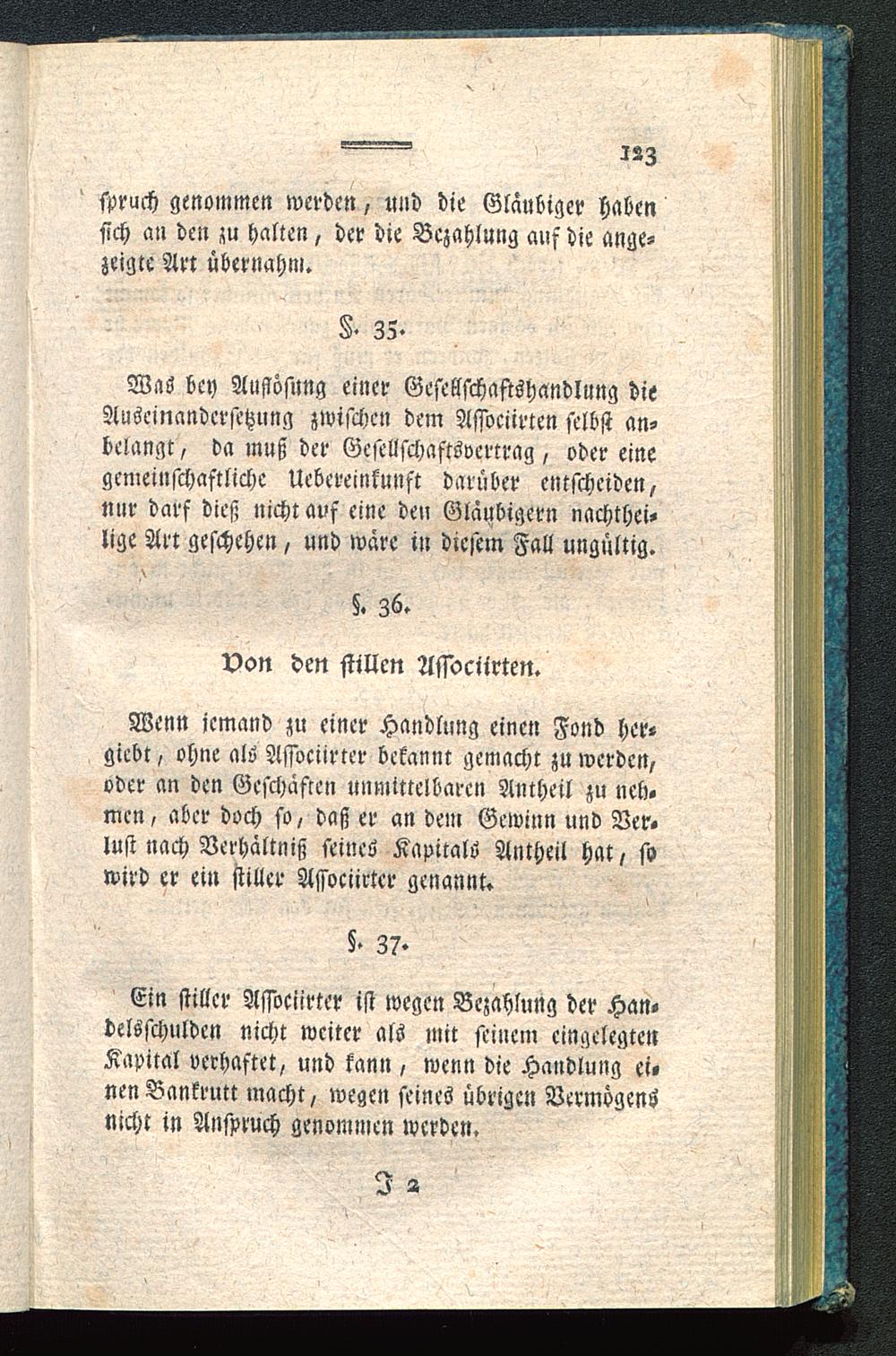 Wenn jemand zu einer Handlung einen Fond her-gicbt, ohne als Associirter bekannt gemacht zu werden,oder an den Geschäften unmittelbaren Antheil zu nek>.mcn, aber doch so, daß er an deut Gewinn und Der.tust nach Verhältniß seines Kapitals Antheil hat, sowird er ein stiller Associirter genannt.
