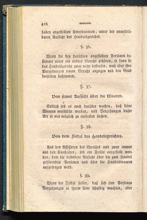 Aus den Assessoren des Gerichts und zwar immeraus den Kaufleuten, soll ein Fiskal aufgestellt wer-de» , dem die besondere Aufsicht über die zum Handelgehörenden Personen und über die Handelswaarenaufgetragen wird.