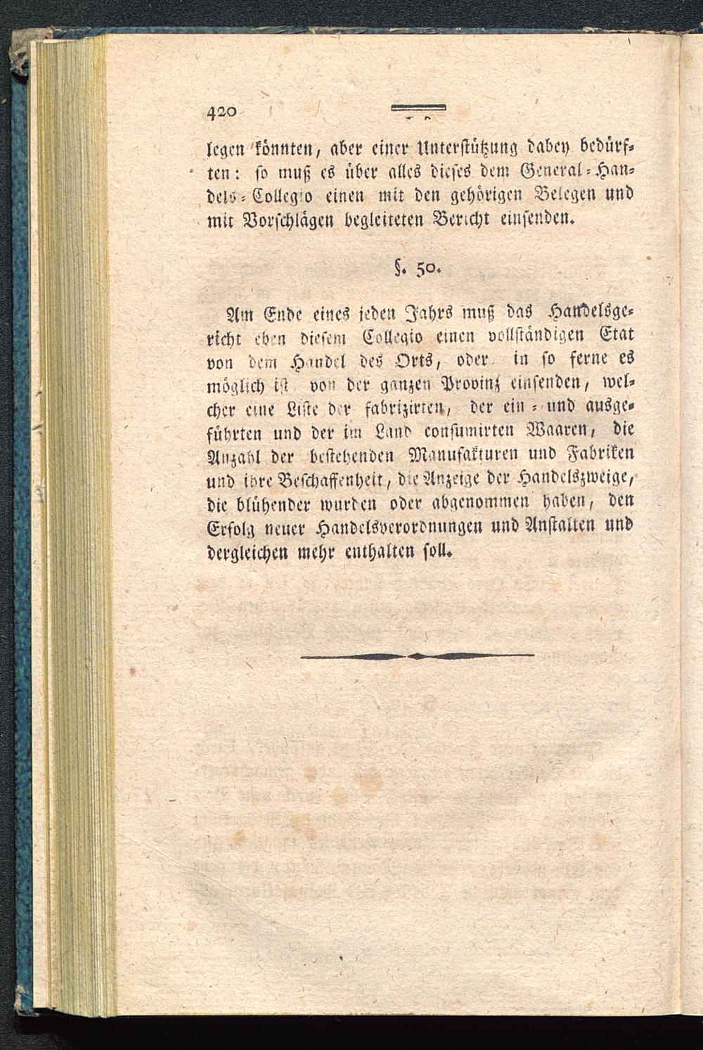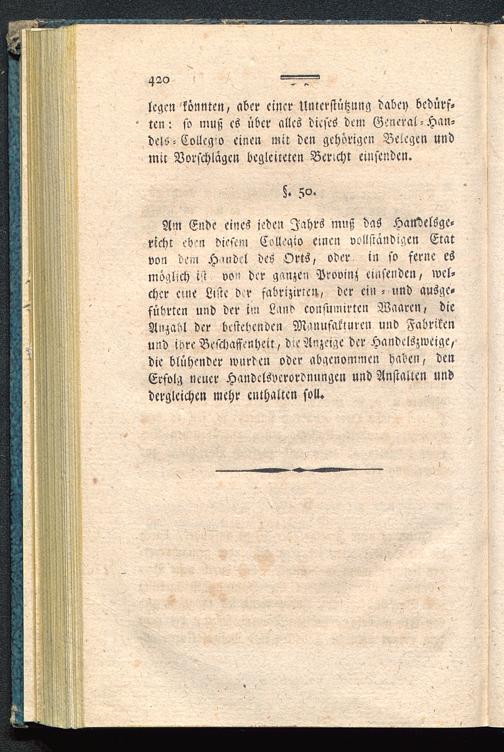 Am Ende eines jeden Jahrs muß das Handelsge-richt ebm diesen, Eollegio cmen vollständigen Etatvon dem H'ndcl des Orts, oder in so ferne esmöglich ist von der ganzen Provinz einsenden, wel-cher cuie Liste d r fabrizieren, der ein - und ausge-führten und der im Land consumirtcn Waaren, dieAnzahl der bestehenden Manufakturen und Fabrikenund ibre Beschaffenheit, die Anzeige der Handelszweige,die blühender wurden oder abgenommen haben, denErfolg neuer Handelsverordnungen und Anstalten unddergleichen mehr enthalten soll.