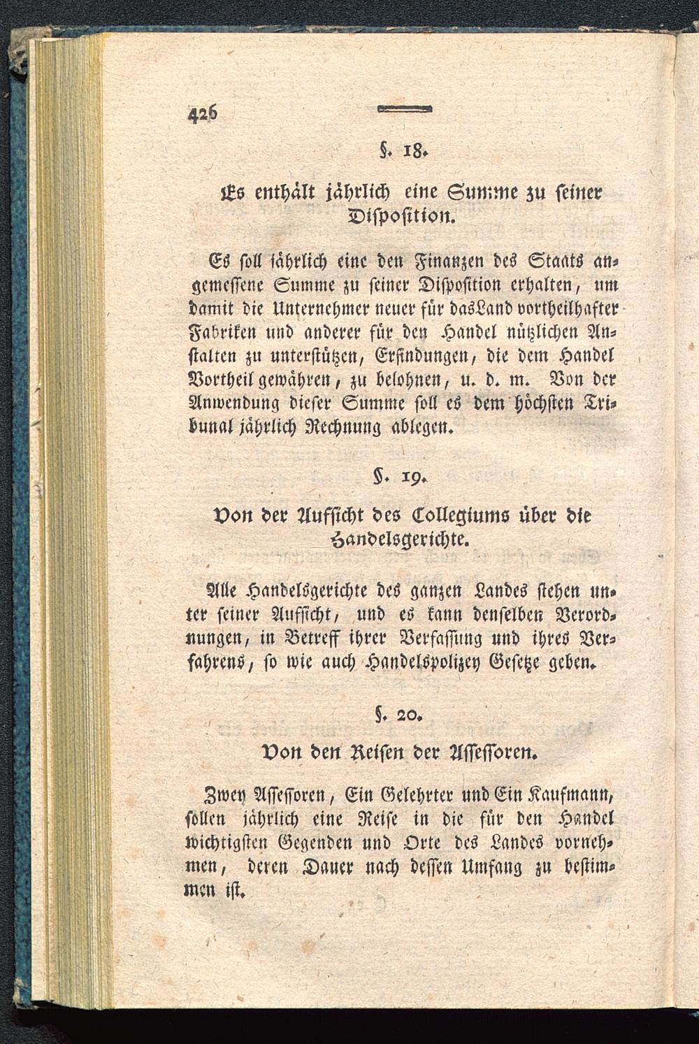 Zwey Assessoren, Ein Gelehrter und Ein Kaufmann,sollen jährlich eine Reife in die für den Handelwichtigsten Gegenden und Orte des Landes vorneh-men, deren Dauer nach dessen Umfang zu bestim-men ist.