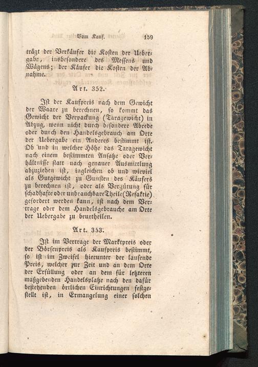 Ist der Kaufpreis nach dem Gewichtder Waare zu berechnen, so kommt dasGewicht der Verpackung (Taragewicht) inAbzug, wenn nicht durch besondere Abredeoder durch den Handelsgebrauch am Orteder Uebergabe ein Anderes bestimmt ist.Ob und in welcher Höhe das Taragewichtnach einem bestimmten Ansäße oder Ver-haltnisse statt nach genauer Ausmitllungabzuziehen ist, ingleichcn ob und wievielals Gutgewicht zu Gunsten des Käuferszu berechnen ist, oder als Vergütung fürschadhafte oder unbrauchbareTheile(Refaktie).gefordert werden kann, ist nach dem Ver-trage oder dem Handclsgebrauche am Orteder Uebergabe zu beurtheilen.