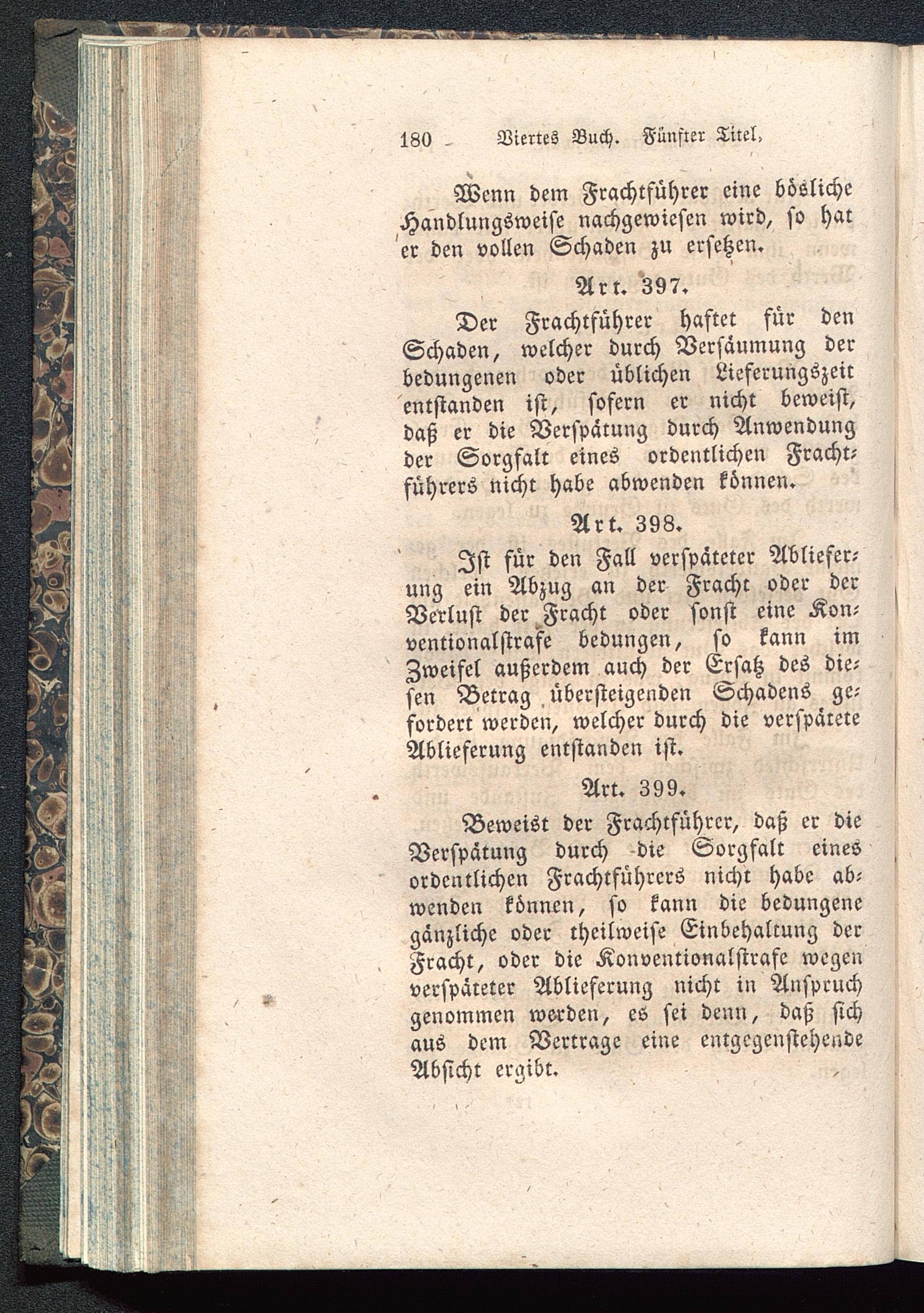 Art. 397.Der Frachtführer haftet für denSchaden, welcher durch Versäumung derbedungenen oder üblichen Lieferungszeitentstanden ist, sofern er nicht beweist,daß er die Verspätung durch Anwendungder Sorgfalt eines ordentlichen Fracht-führers Nicht habe abwenden können.