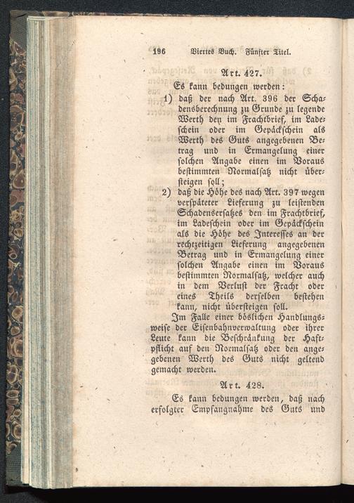 1) daß der nach Art. 396 der Scha-densberechnung zu Grunde zu legendeWerth den im Frachtbrief, im Lade5schein oder im Gepackschein alsWerth des Guts angegebenen Be-trag und in Ermangelung einersolchen Angabe einen im Vorausbestimmten Normalsatz nicht über-steigen so.ll;