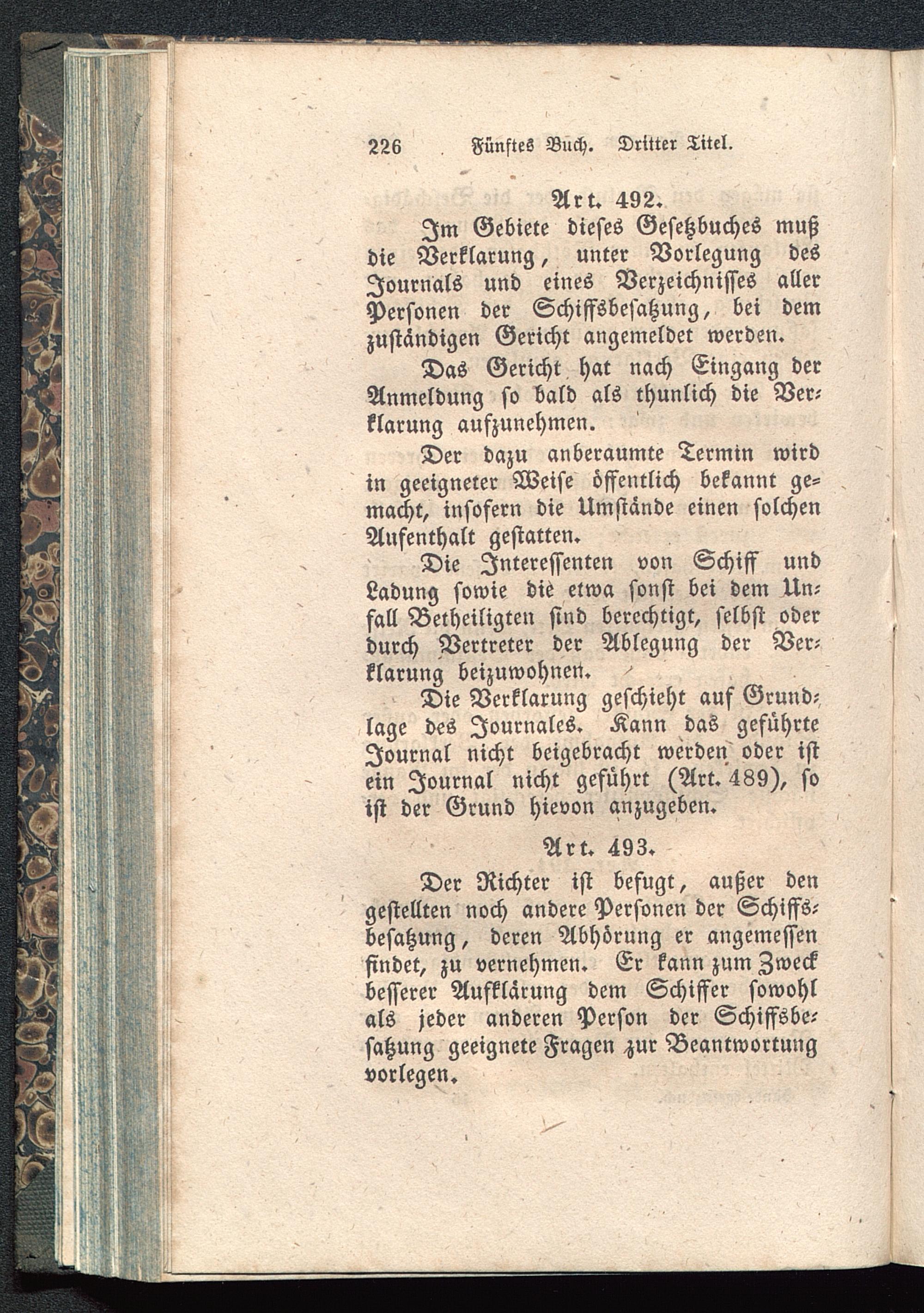 Im Gebiete dieses Gesetzbuches mußdie Verklarung, unter Vorlegung desJournals und eines Verzeichnisses allerPersonen der Schiffsbesaßung, bei demzustandigen Gericht angemeldet werden.