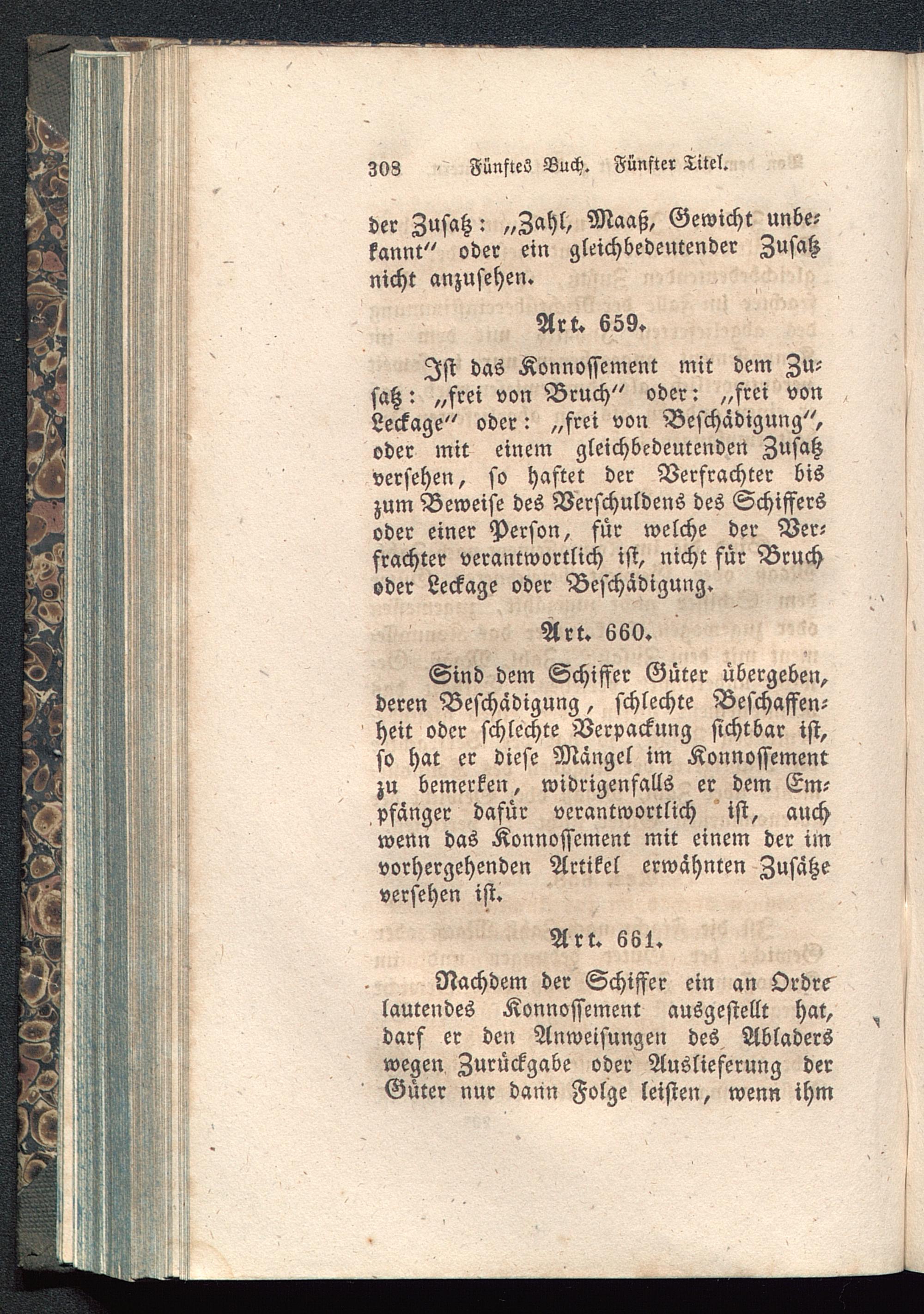 Sind dem Schiffer Güter übergeben,deren Beschädigung, schlechte Beschaffen-heit oder schlechte Verpackung sichtbar ist,so hat er diese Mängel im Konnossementzu bemerken, widrigenfalls er dem Em-pfänger dafür verantwortlich ist, auchwenn das Konnossement mit einem der imvorhergehenden Artikel erwähnten Zusätzeversehen ist.