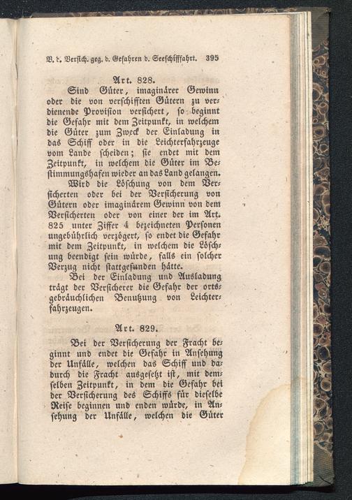 Sind Güter, imaginärer Gewinnoder die von verschifften Gütern zu ver-dienende Provision versichert, so beginntdie Gefahr mit dem Zettpunkt, in welchemdie Güter zum Zweck der Einladung indas Schiff oder in die Leichterfahrzeugevom Lande scheiden; sie endet mit demZeitpunkt, in welchem die Güter im Be-stimmungshafen wieder an das Land gelangen.