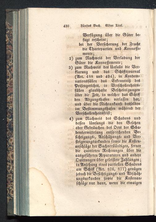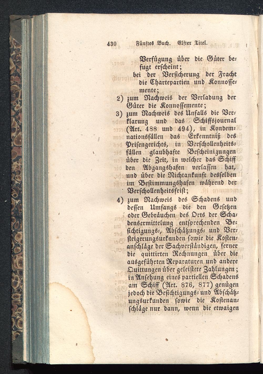 ! oder Gebräuchen des Orts der Scha-densermittelung entsprechenden Be-sichtigungs-, Abschätzungs- und Ver-stetgerungsurkunden sowie die Kosten-anschlage der Sachverständigen, fernerdie quittirten Rechnungen über dieaasgeführten Reparaturen und andereQuittungen über geleistete Zahlungen;in Ansehung eines partiellen Schadensam Schiff (Art. 876, 877) genügenjedoch die Besichtigungs-und Abschaß-ungsurkunden sowie die Kostenan-schlage nur dann, wenn die etwaigen